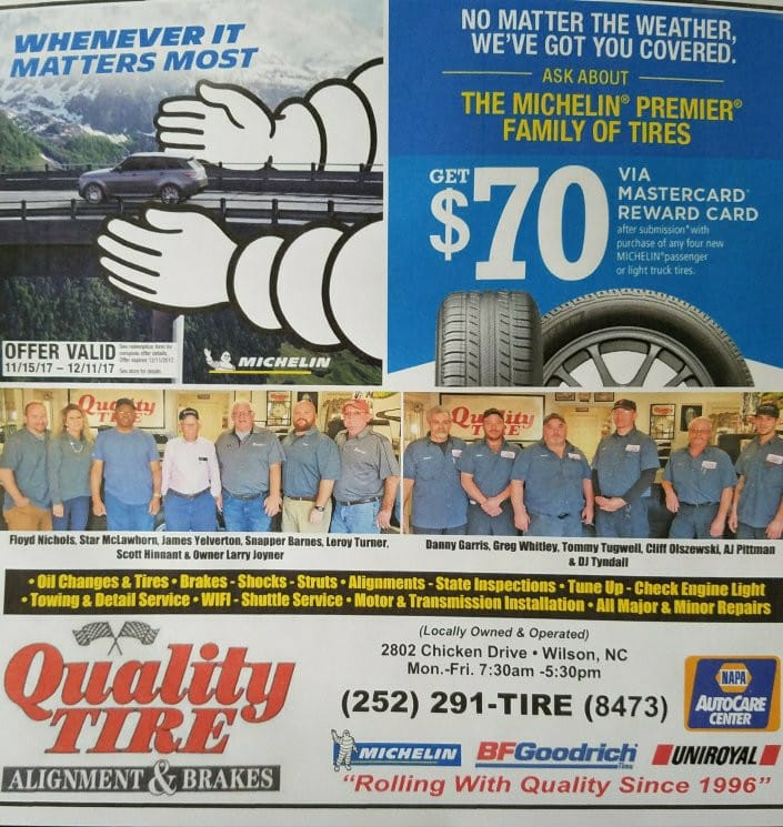 Quality Tire Alignment & Brakes is an independent, family-owned auto repair shop serving Wilson, NC and surrounding areas. As a BBB (Better Business Bureau) shop and NAPA AutoCare Center, they employ ASE-certified technicians who undergo continuous training to maintain their certification and stay up to date on the best repair practices for your vehicle. They offer services for preventive maintenance, tires, and wheels. Customers praise the shop's great people, friendly service, and ability to get the job done in a timely fashion, even in urgent situations. The shop is known for its knowledgeable, reliable, and excellent service, making it a go-to for customers' car needs.
