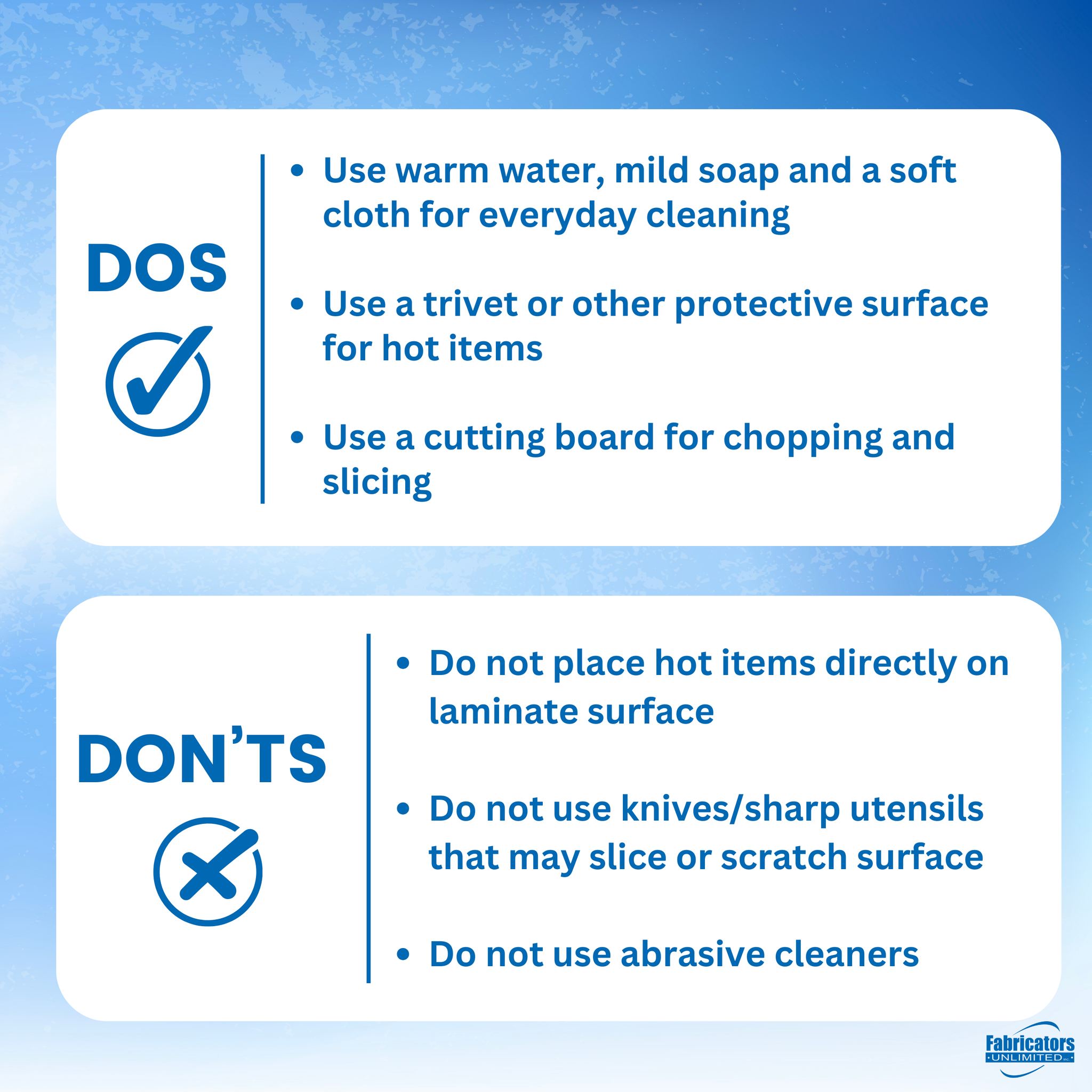 When you need custom countertops of the highest quality, turn to Fabricators Unlimited. For over 35 years, our countertop company has been fabricating quartz, solid surface, natural stone and laminate countertops for our customers. Our experienced craftsmen, top-of-the-line fabrication equipment and next-level customer service set us apart from other fabricators. Call now to schedule reliable countertop fabrication services. You can trust our team of professionals to design and create the unique countertops you've been envisioning. We offer our services throughout multiple states.