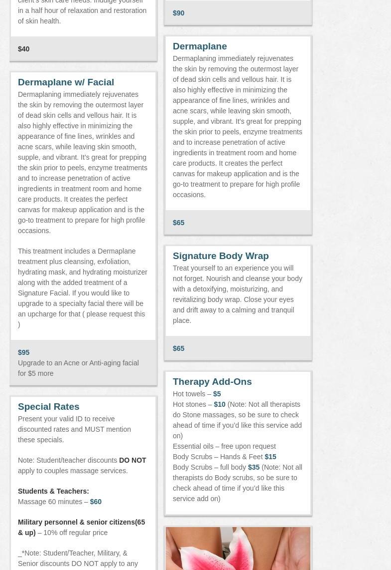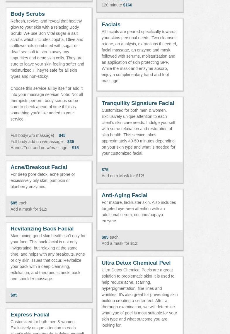 $10 off your 1st 1hr Massage! Tranquility Spa & Massage is a locally owned business that brings a new meaning to relaxation and healing through our devotion to free the mind and body of stress and tension. With our healing touch and attention to wellness, clients will leave the Spa with a feeling of serenity and a higher knowledge of the benefits of our services. Tranquility Spa & Massage offers several different types and durations of massage, facials, dermaplane, spray tan, waxing and lash and nail services. We offer massage packages, gift certificates and can accommodate groups if the party groups far enough in advance. Tranquility's desk hours are Monday - Friday 11am-1pm. Sessions are by appointment.