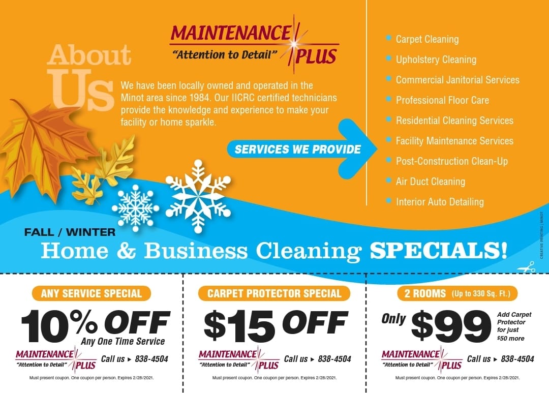 Serving the Minot, ND and surrounding communities for 40 years. With high quality cleaning services to include: hot water extraction carpet cleaning, furniture cleaning, janitorial and maintenance services for commercial offices and residential homes, air duct cleaning, hard surface floor-care & construction clean-up. Our technicians are trained and certified. We are locally owned and operated. Licensed, bonded and insured.