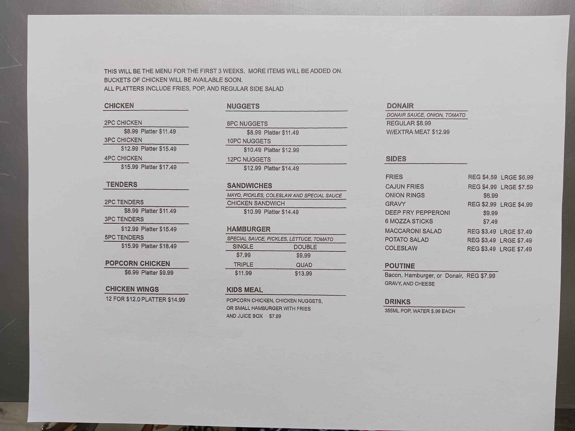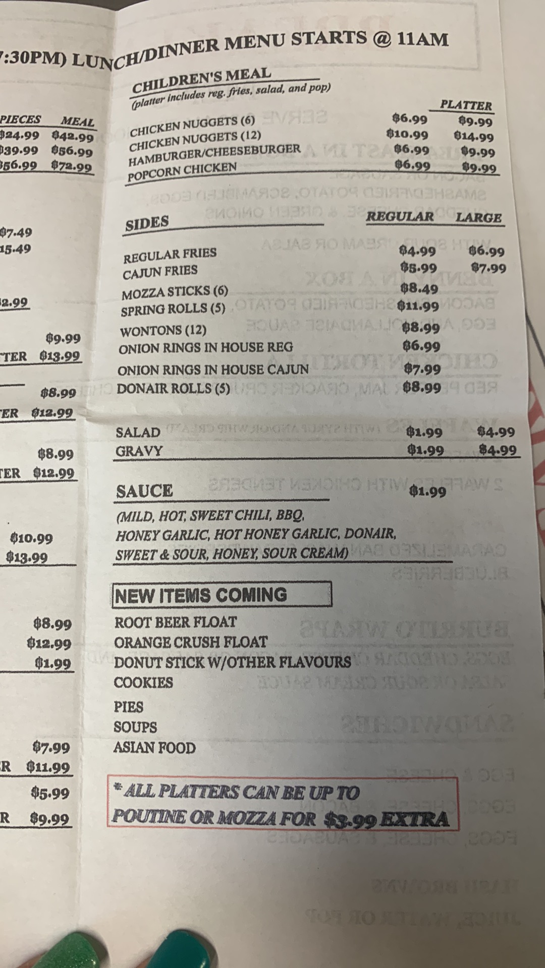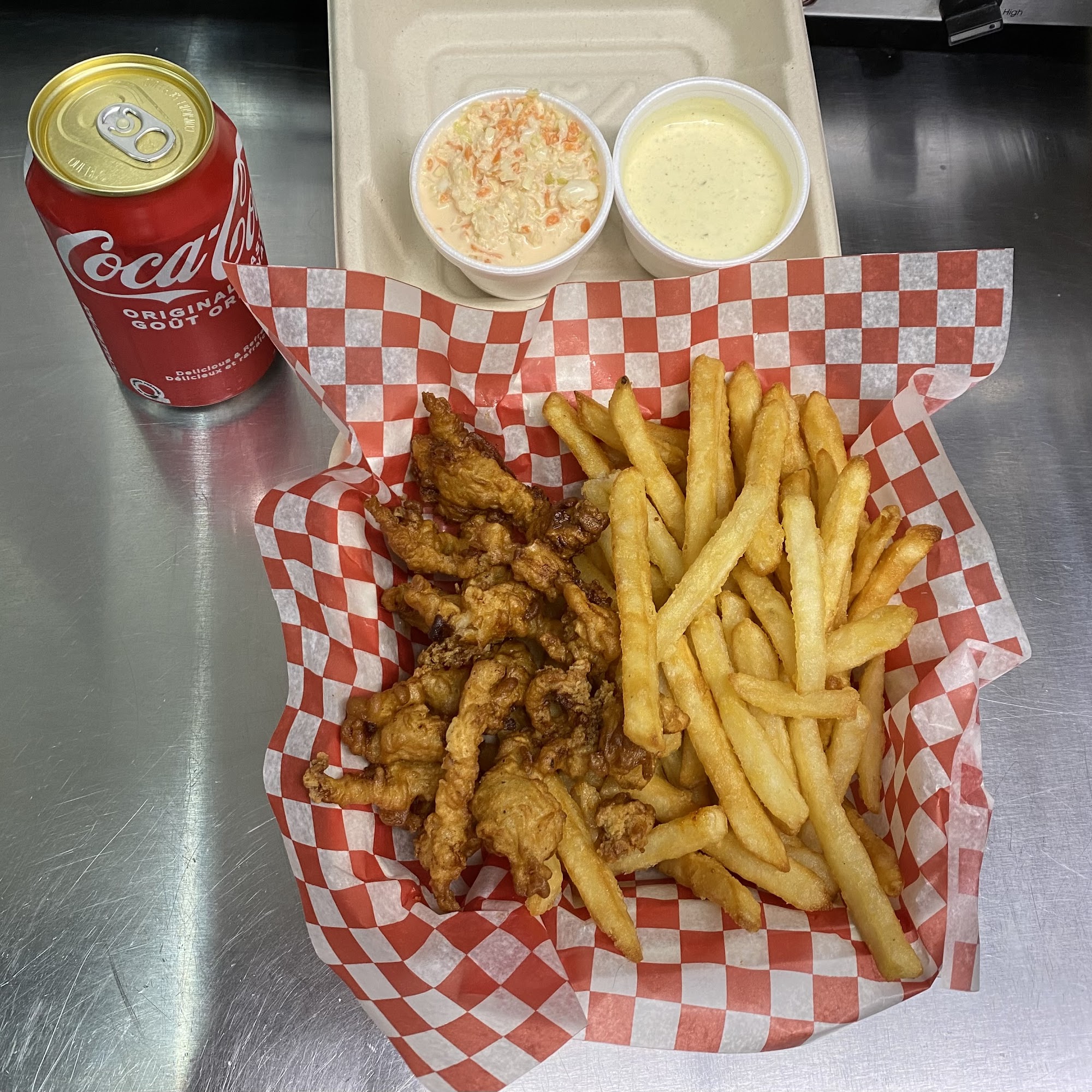 The food is fantastic. My husband always gets the chicken burger, he says it’s the best he’s ever had. Chicken tenders are homemade and exceptionally tender, love them. Always get more for your buck. Everything is cooked fresh. The fries are NOT left sitting or dipped the second time around, I love them always crispy.