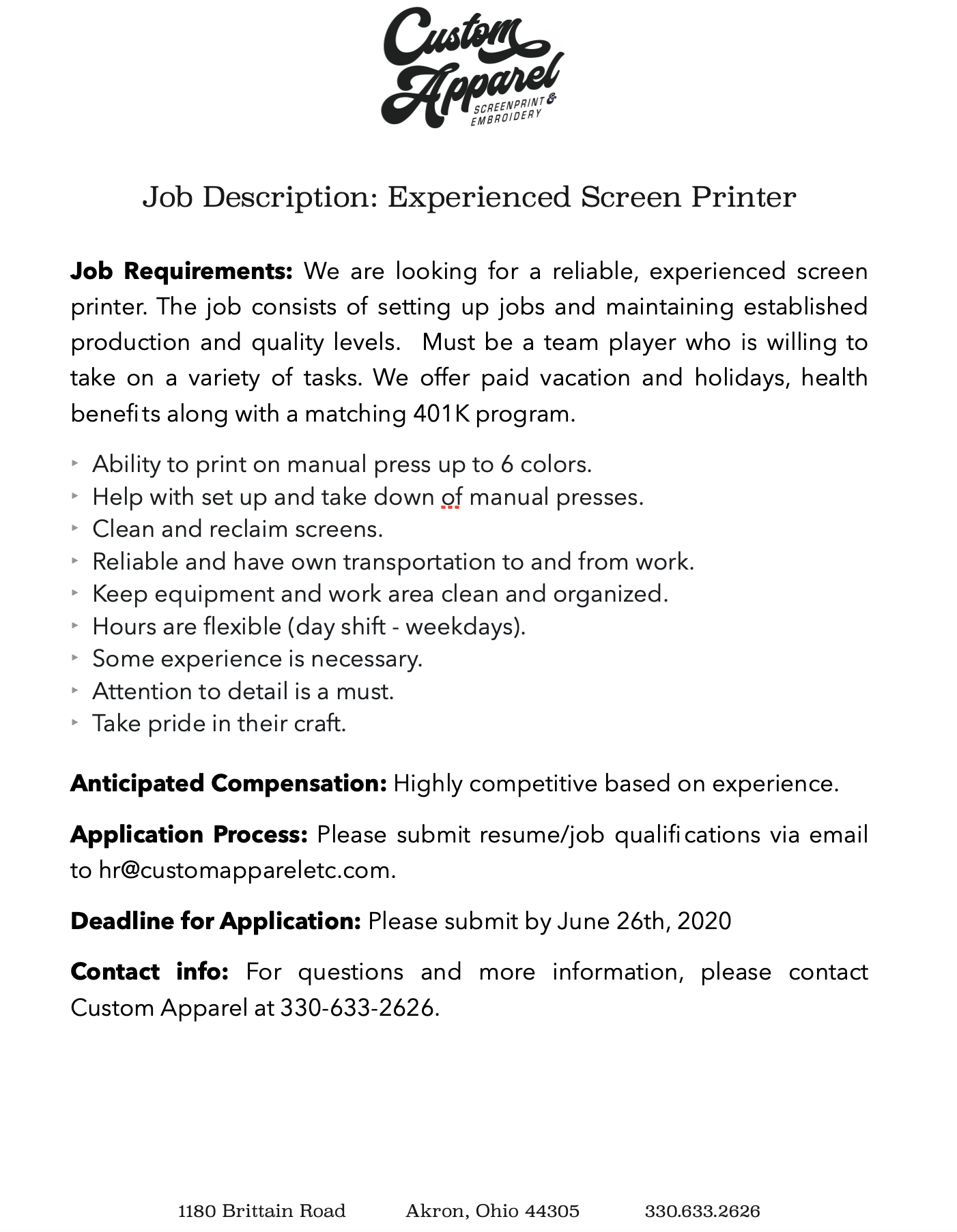 Great staff, quality shirts, sweatshirts, jackets, hoodies, t-shirts, quality printing, reasonable prices.