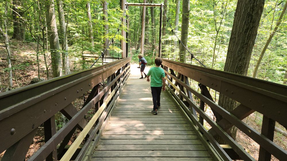 F.A. Seiberling Nature Realm is a beautiful outdoor area with many trails through gardens and wooded areas. Visitors can enjoy three different trails, including Fernwood, Cherry Lane, and Nuthatch, which are mostly dirt, gravel, or paved and are suitable for easy walks. The realm features scenic spots such as Echo and Seneca ponds, and a suspension bridge over a hollow adds to the charm. The gardens and herb areas provide interesting sights and information about native trees and vegetation. The Nature Center has large windows to view the surroundings, and staff are friendly and helpful, especially for families with children. There are indoor and outdoor activities that keep kids occupied, and a covered picnic shelter is available for snacks or lunch. Wildlife sightings, like a beaver crossing the path, add excitement to the visits. The realm is also part of a tradition for many, with visitors completing the Fall Hiking Spree and collecting shields. Overall, it is a peaceful place perfect for walking, exploring nature, and enjoying the scenery.