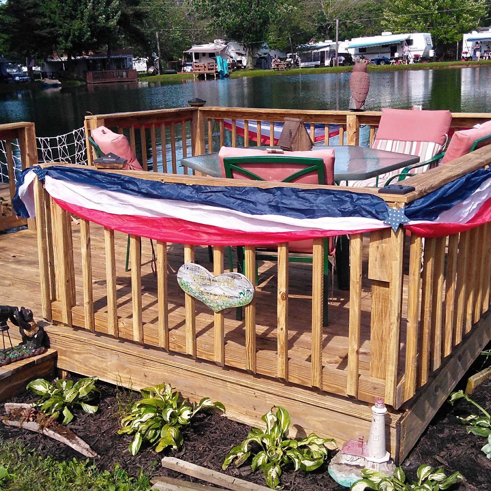 A beautiful place, 2 ponds with fountains and a large swimming pool, game room, and very nice people. Mostly long-term, but a few overnight spots. We called at 6:00 p.m., but got a spot without sewer.
