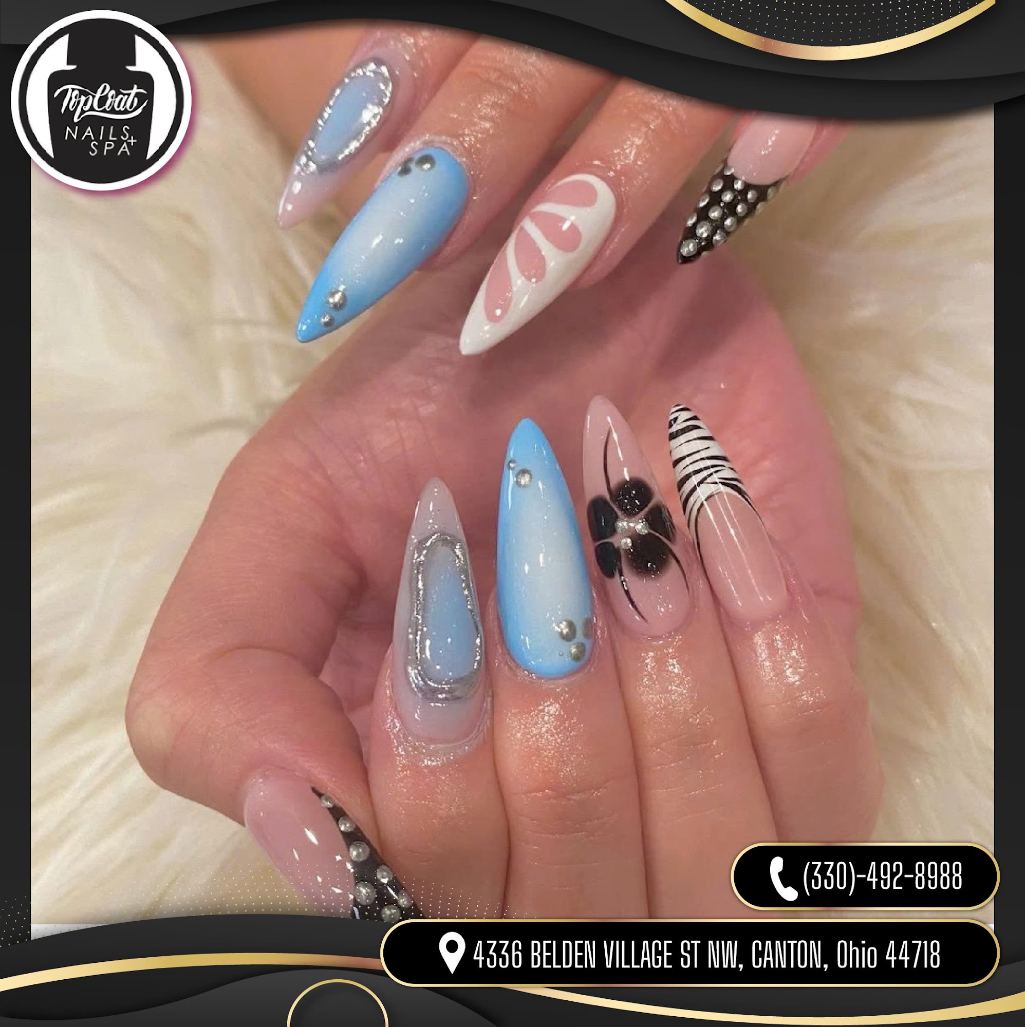 Located at a beautiful corner in Canton, OH 44718, Top Coat Nails & Spa is a regular nail salon for everyone, as we always try our best to deliver the highest level of customer satisfaction. Our goal is to make each client feel comfortable and special! You will always receive the best services and friendly smiles from our talented staff. We offer our clients the maximum in style, quality, and customer service. We invite you to experience the difference in our services. Sanitation is always on top of our priorities. We strictly implement the sanitation guidelines for beauty spa to ensure clients’ safety. Along with the standard hygiene procedures, all the products we use in the salon are from the most famous manufacturers.