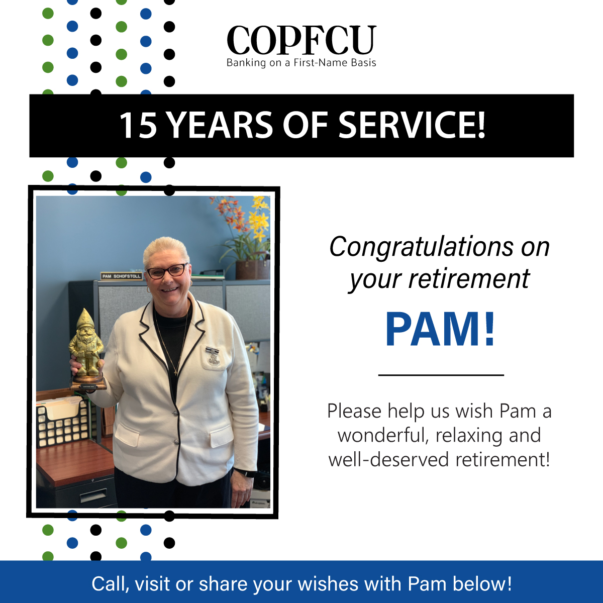 COPFCU continues to serve its members like no other. For the past 25 years, they have met all my financial needs with exceptional service. Thanks Diane!
