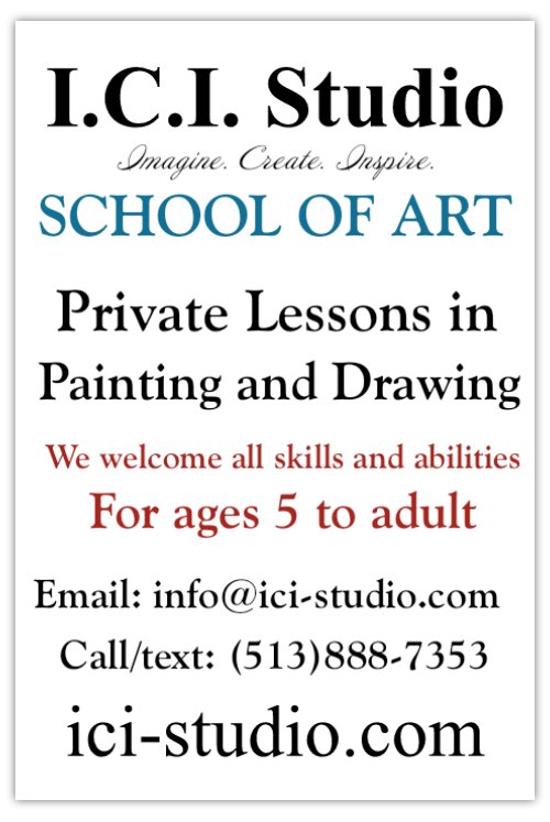 OFFERING PRIVATE PAINTING AND DRAWING LESSONS FOR AGES 4 TO ADULT! Open since 2015 and located in Montgomery, I.C.I. Studio specializes in private art lessons featuring painting, drawing, digital art, and more! We are the only dedicated private art lesson school in Ohio! Our Approach: At I.C.I. Studio, we believe that art is about more than just technical skill - it is about self-expression, creativity, and exploration. We provide high-quality art education to aspiring artists. Our approach is centered on the individual needs and interests of each student, and we strive to create a supportive environment that encourages artistic growth and experimentation.