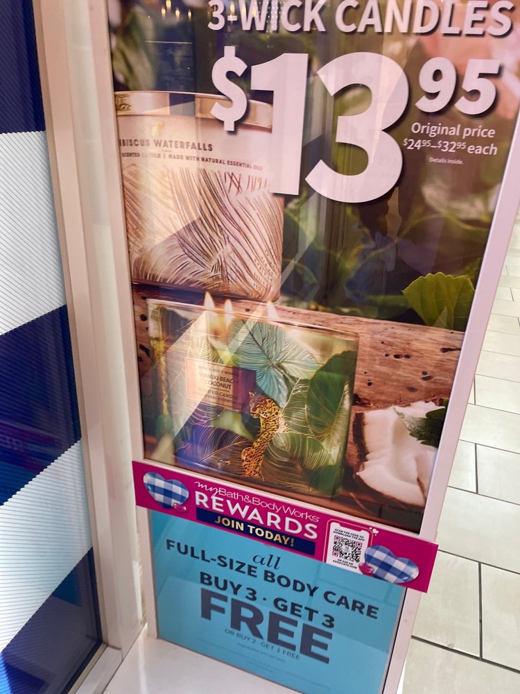 Bath & Body Works offers a wide range of great products with good deals. Customers are generally pleased with the friendly and helpful staff, who provide recommendations on relaxing aromatherapy items. The store has a nice selection of merchandise, including scented candles in various sizes and fragrances, such as Japanese Cherry Blossom, Black Teakwood, and Ocean Driftwood. Customers recommend taking advantage of sales, rewards programs, and email updates to stay informed about the latest deals. Overall, Bath & Body Works provides a pleasantly scented and memorable shopping experience.