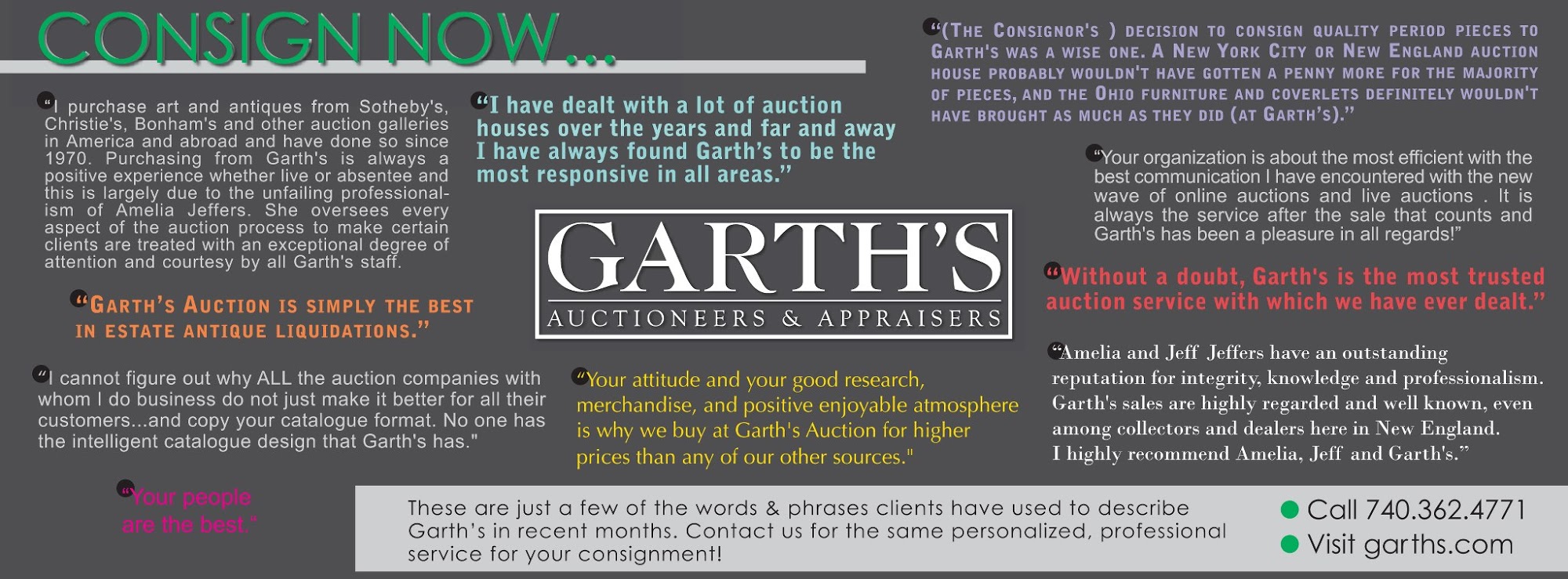 My family and I have sold many pieces with Garth's Auctions. Mr. Jeffers and his professional staff have been very courteous and kind. I am very pleased with the final auction results.