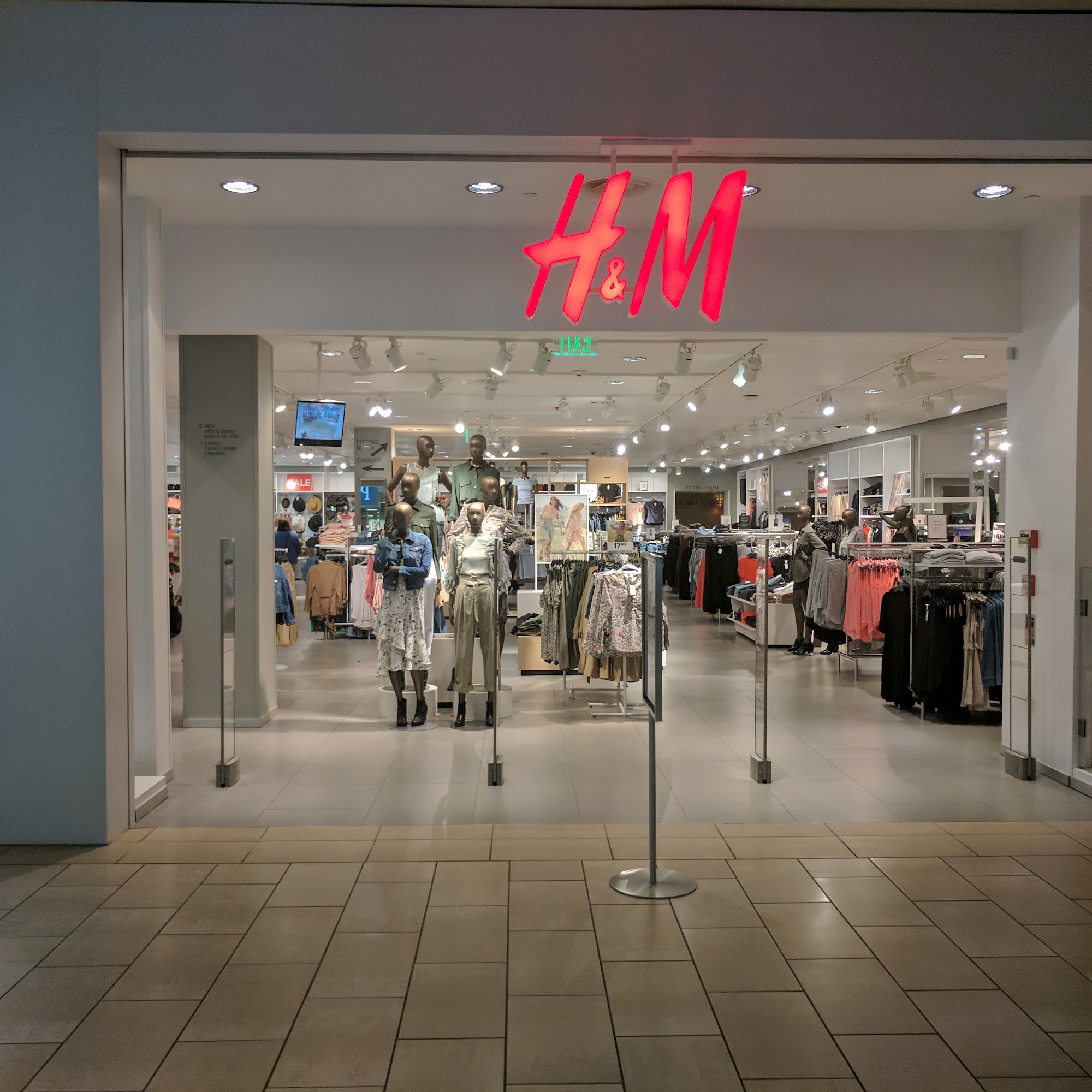 Modern H&M with a variety of clothing items and decent pricing. Place is lit up like a roman candle.