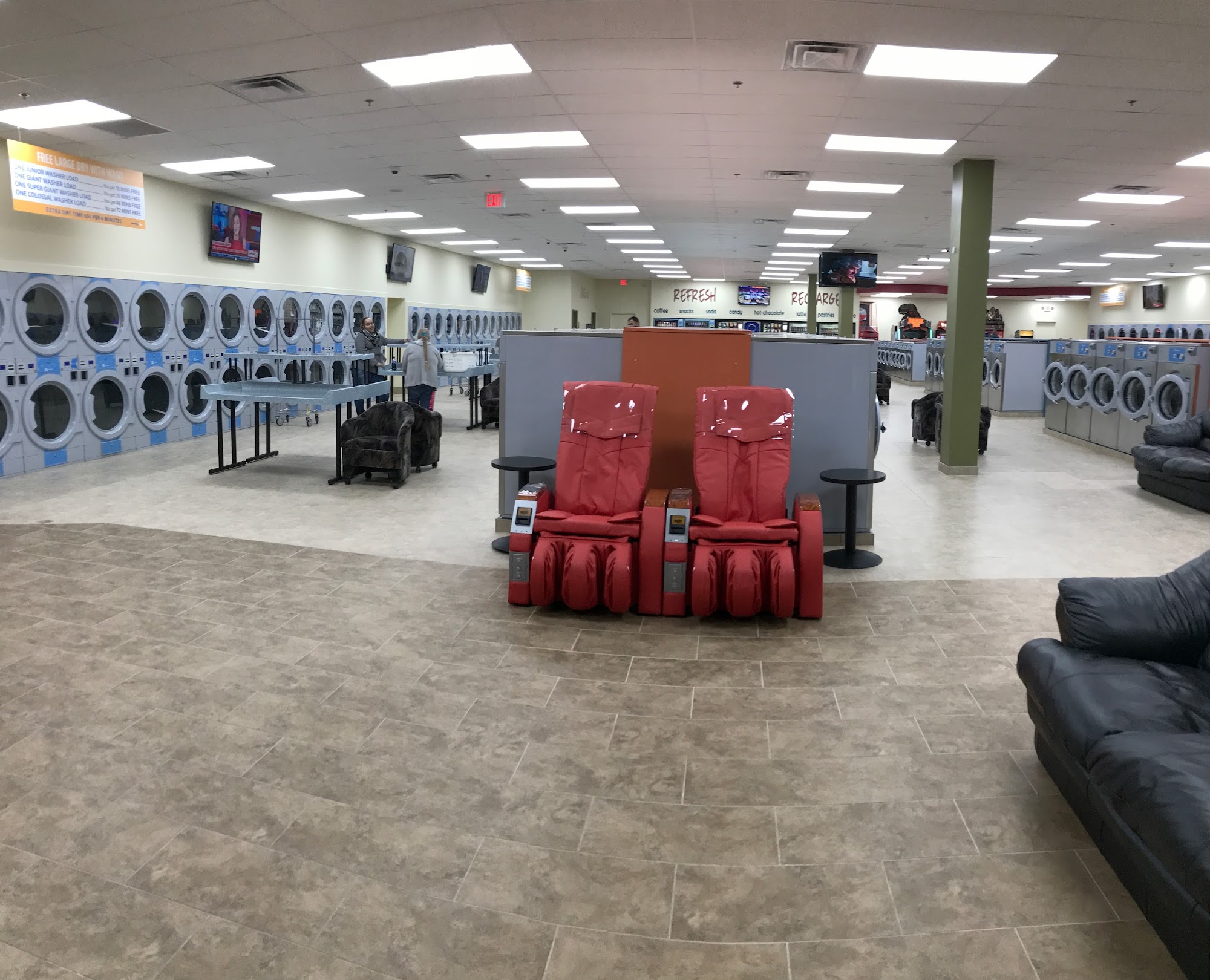 LaundryMax is a clean and well-equipped laundry facility that offers a convenient and pleasant experience for customers. The place features modern machines that work well and are easy to use, with a system that accepts cards for payment. Customers can enjoy amenities such as vending food and drinks, multiple TVs, comfortable chairs, folding tables, and carts for laundry and hanging clothes. The facility is spacious, with enough seating and laundry supplies like detergent available for purchase. The staff's attitude varies; some customers have received friendly and helpful service, especially when assisted by attentive staff members. However, others have experienced rude or inattentive behavior from employees, which can impact the overall experience. The place tends to be busier on weekends, but even then, the process remains smooth. The dryers are free, and the place is not overpriced, making it accessible for many. Overall, LaundryMax is a solid choice for laundry needs, especially when machines are functioning properly and staff are helpful. Despite occasional issues with customer service and broken amenities like massage chairs, it remains a clean, convenient, and efficient laundry spot for those seeking a good place to wash and dry clothes.