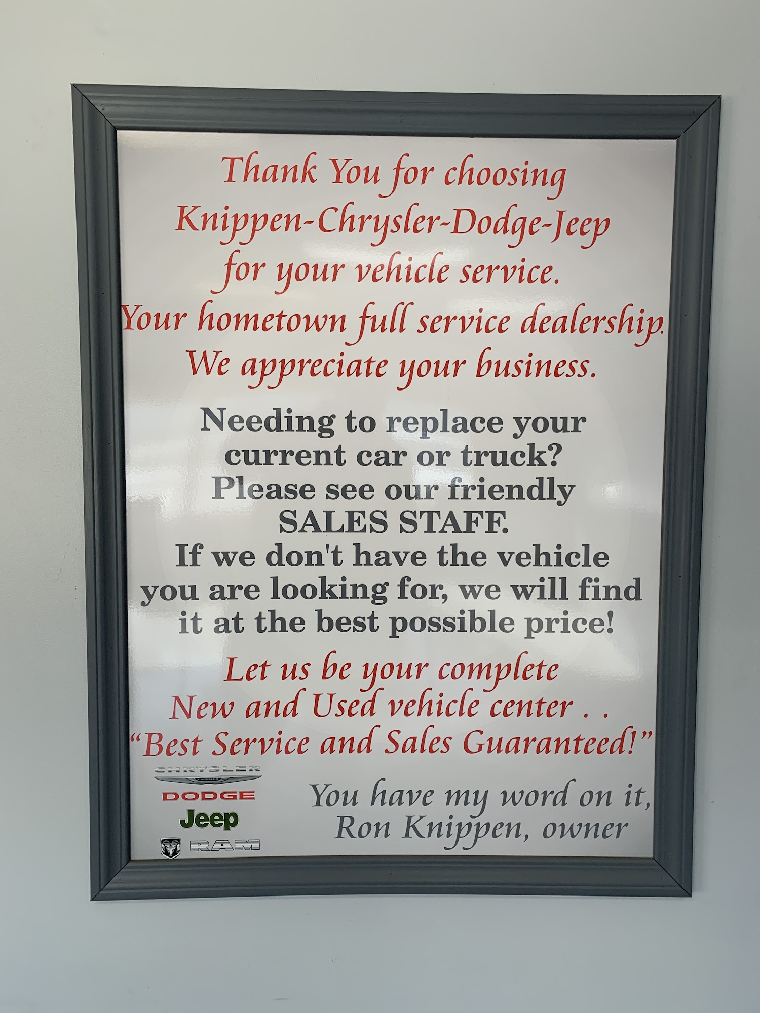 Knippen Chrysler Dodge Jeep Ram is recognized as a top dealership, offering excellent service and communication. Customers appreciate the friendly staff, who work hard to meet their needs. Those who purchase vehicles, like the Jeep, often return for service, where technicians, such as Mike, are noted for their attention to detail. The dealership also accommodates larger vehicles, providing oil changes and maintenance for RVs. Loaner cars are available, enhancing customer convenience. Overall, Knippen Chrysler Dodge Jeep Ram is a reliable place to buy and service vehicles, ensuring customer satisfaction at every visit.