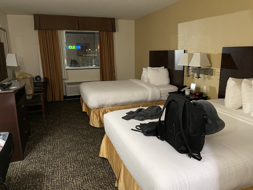 The Best Western Inn is a great value hotel conveniently located very close to the airport, with a free shuttle service, and just off the main highway. It is considered a good budget-friendly option, acceptable for a stopover or in a pinch. Check-in is typically described as smooth, quick, and easy, though one front desk interaction was noted as less than friendly. The lobby is nice, and staff are generally respectful and friendly. Rooms are decent sized and relatively clean, with huge bathrooms, plenty of towels, and provided shampoo and conditioner. Beds are often comfortable, though some reviews mentioned lumpy beds, torn sheets or pillowcases, and one instance of a strong body odor on a comforter. The furniture and overall interior are described as a little tired and could use some updates and sprucing up. Some maintenance issues were reported, such as loose toilet seats, problematic shower heads, and a frayed refrigerator cord. While the hotel is smoke-free, the hallways and a back stairwell sometimes reeked of cigarettes. Amenities include a small fitness room with a TV, a pool that looked clean but with a tired-looking area, and free coffee available anytime. Breakfast is frequently called awesome and great with a huge variety and selection of hot and cold choices, though some experiences found it somewhat less than expected, with items occasionally empty and staff not always refilling them promptly. It does not start until 7 am. The parking lot is well-lit. The area of town seems a bit sketchy to some, but there are varied restaurants nearby, including some within walking distance like a coffee shop and sub shop, though others note not much is in walking distance. Overall, it is seen as a decent place that will do in a pinch, with many guests stating they would stay here again.
