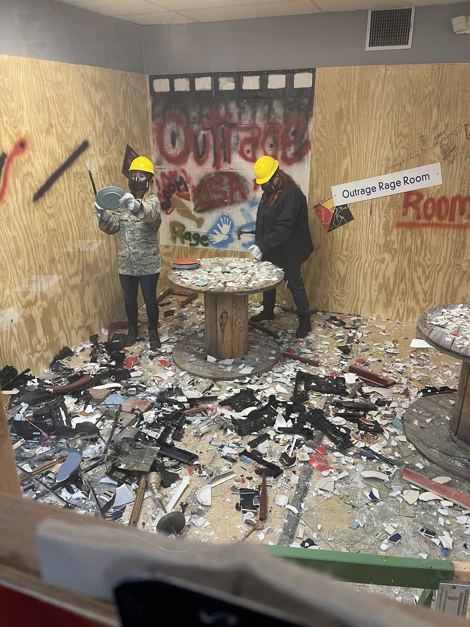 Have you ever heard of a rage room? It’s somewhere everyday folks can take out their anger- uninhibited and pure, let it all out! We call ours OutRage. We are located in Kent, Ohio. We provide a safe, fun environment for those seeking to feel better after a Hard day of work, experienced a tragedy and need a release, fun date night and those seeking new experiences. It is our utmost desire to provide many options to fit everyone’s needs and cravings through packages and customizable options. Don’t worry though, it’s perfectly safe. We provide full protective gear including: – Protective wear – Hard hat with face mask – Gloves What you must have 1. Closed toed shoes 2. Long pants 3. And a desire to have fun We also have a splatter paint room