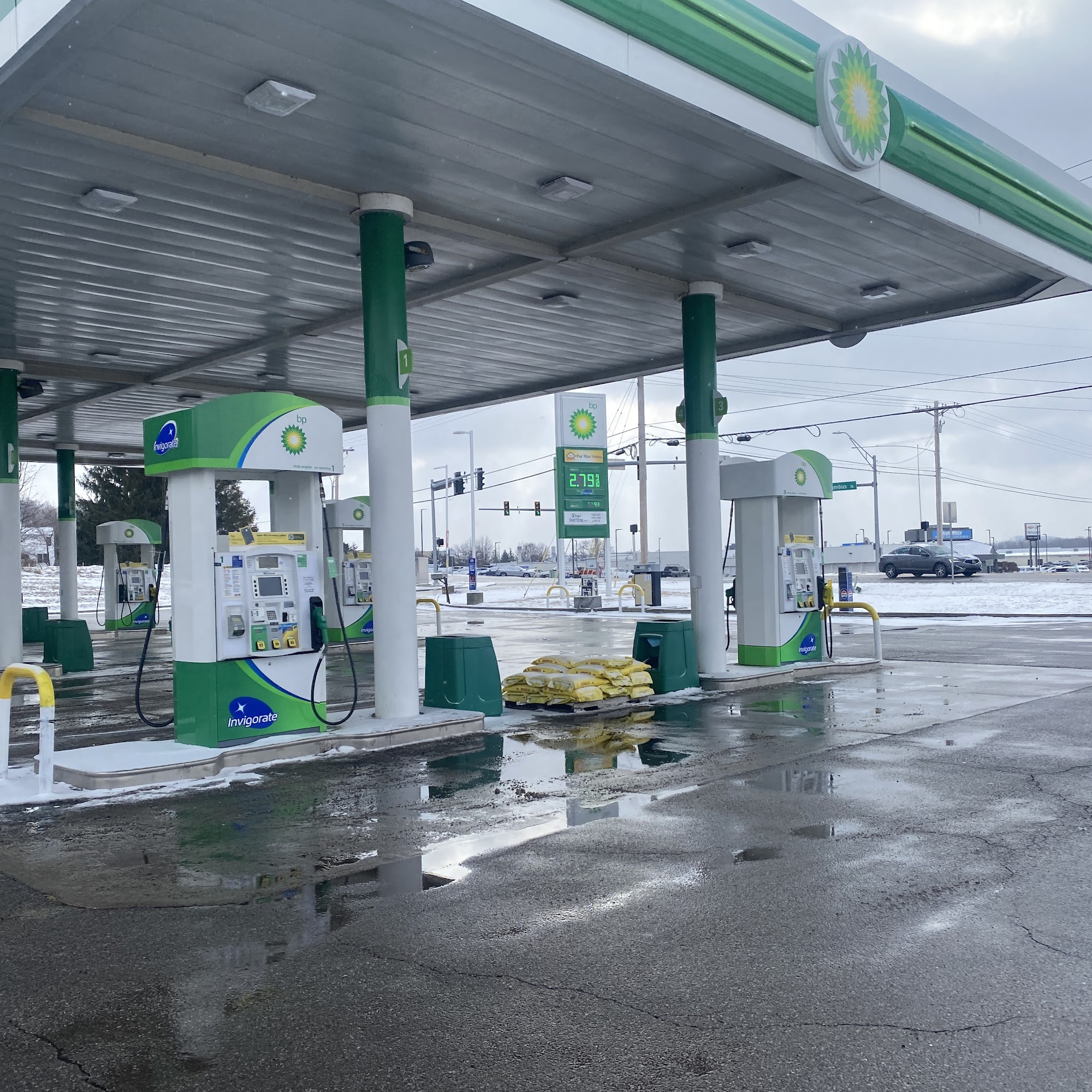 Lots of pumps and free windshield squeegees good coffe