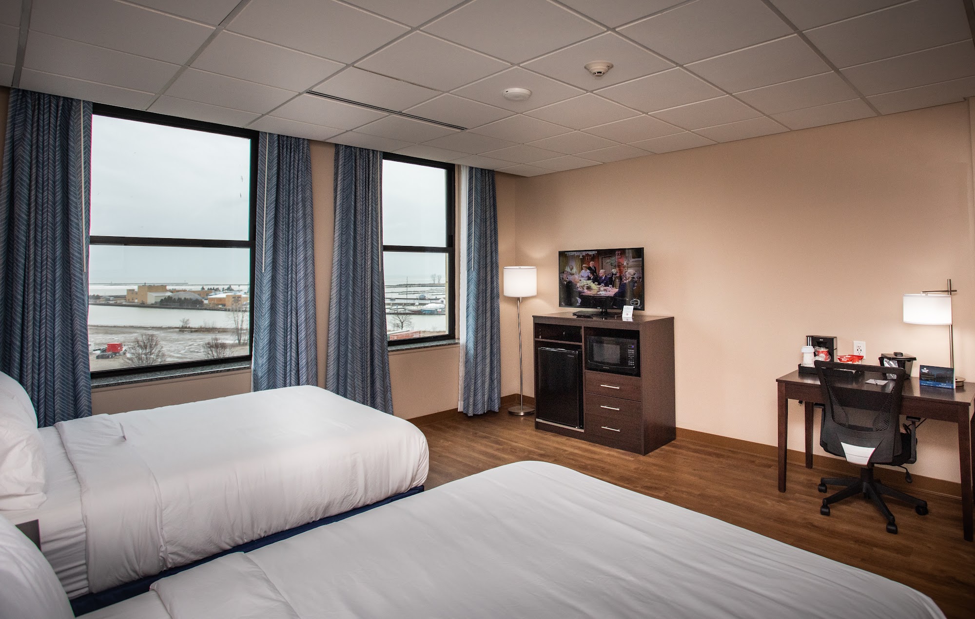 The Ariel Broadway Hotel is a wonderful and clean hotel with great staff who are accommodating, helpful, kind, friendly, professional, and understanding. The rooms are nice, clean, spacious, comfortable, and taken care of, with good WiFi and pretty views of the lake. The hotel features cute shops within it. The downstairs restaurant, The Gilmore, is a gem and an upscale anchor, serving superb and delicious food, though some extra charges for items like coffee or beignets have been noted. The bar downstairs offers finger and fried foods with a fun staff, and there is a dope bar and games area. A rooftop bar operates on Friday and Saturday nights when weather permits. The location is a quick walk to Lake Erie, a marina, the lighthouse, and nearby activities like Rockin’ on the River behind the building. Some guests have mentioned minor issues, such as the basement parking garage not having building access when the restaurant is closed, an HVAC system in rooms that guests cannot control themselves, and occasional extra fees for special events. Overall, stays are described as amazing and enjoyable, making it a considered sneak-away hotel.