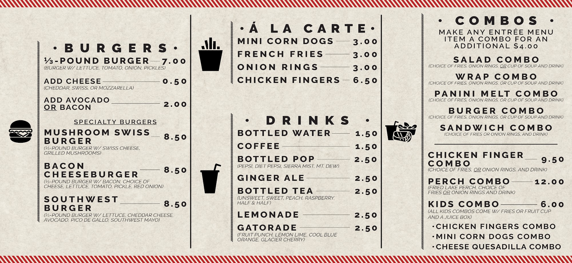 Only open for lunch, has a nice selection of sandwiches, alone or as combos, with fries or onion rings and a drink. Patio gives the opportunity for nice views