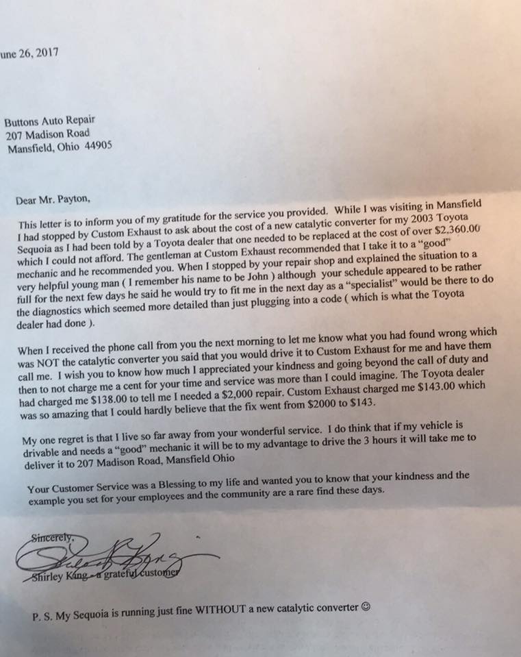 Was able to get my car an appointment in less than 2 days and did an efficient and timely job for a more than fair price!! Thank you Buttons for a job well done!!