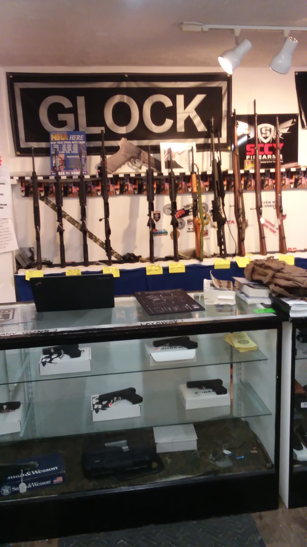 We carry Glock, Ruger, Smith & Wesson, Mossberg, Winchester, Remingto, Sig Sauer, Springfield Armory, Dickinson shotguns, Henry Rifles, Taurus, SCCY, EMF, Bond Arms, ATI Tactical, Hi-point, Targets, Horday, Blazer, CCI, Winchester ammo, Magtech, Federal ammo, American Eagle, Bore Snake, Hoppes, Birchwood Casey, WEEGO, Simmons scopes, Hunting scopes, Guard Dog, Condor, CAA, EMA, LEES Bullet mold, Taylor knives, Marble knives, M&P Shield, Cobra, NRA recuriter, NRA instructor, U.S Law Shield, Berkley, Live Bait, Minnows, Worms, Nightcrawlers, Bass, Crappie, Shad, Red worms, Green worms, Gun Care products, Stud guns, Pepper spray, other personal protection. Guns, ammo, Concealed carry clasees, CCW