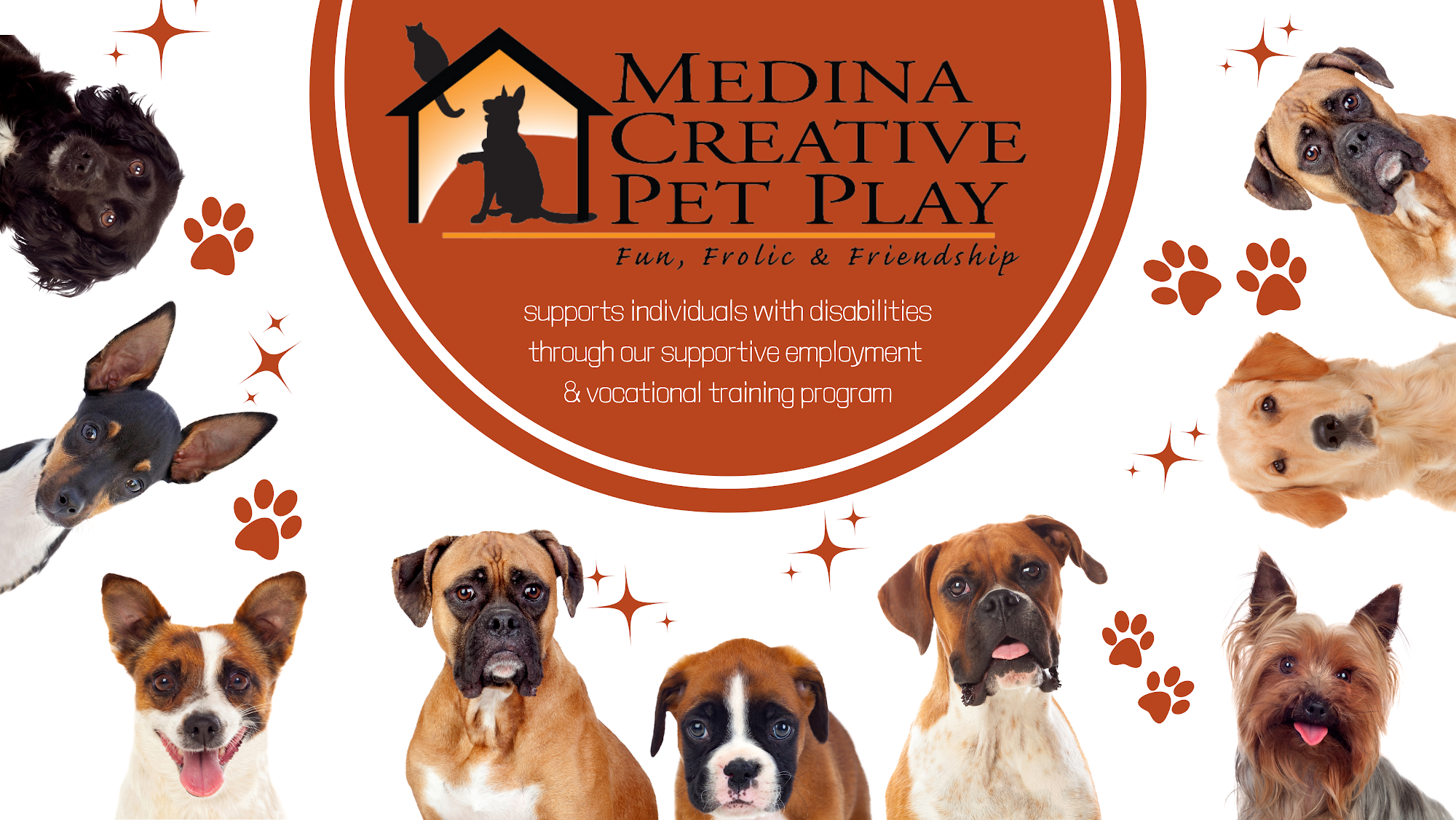 Medina Creative Pet Play is a unique full service doggie daycare and boarding experience. Pet Play supports individuals with disabilities through its supportive employment and vocational training program. Employees are involved in every aspect of pampering your pet including: pet care, spa services, and treat production. Top dog services distinguish Medina Creative Pet Play a paw above the rest with a low caregiver to dog/cat ratio with reasonable rates and so much more! Reservations are preferred, but walk-ins are welcome.