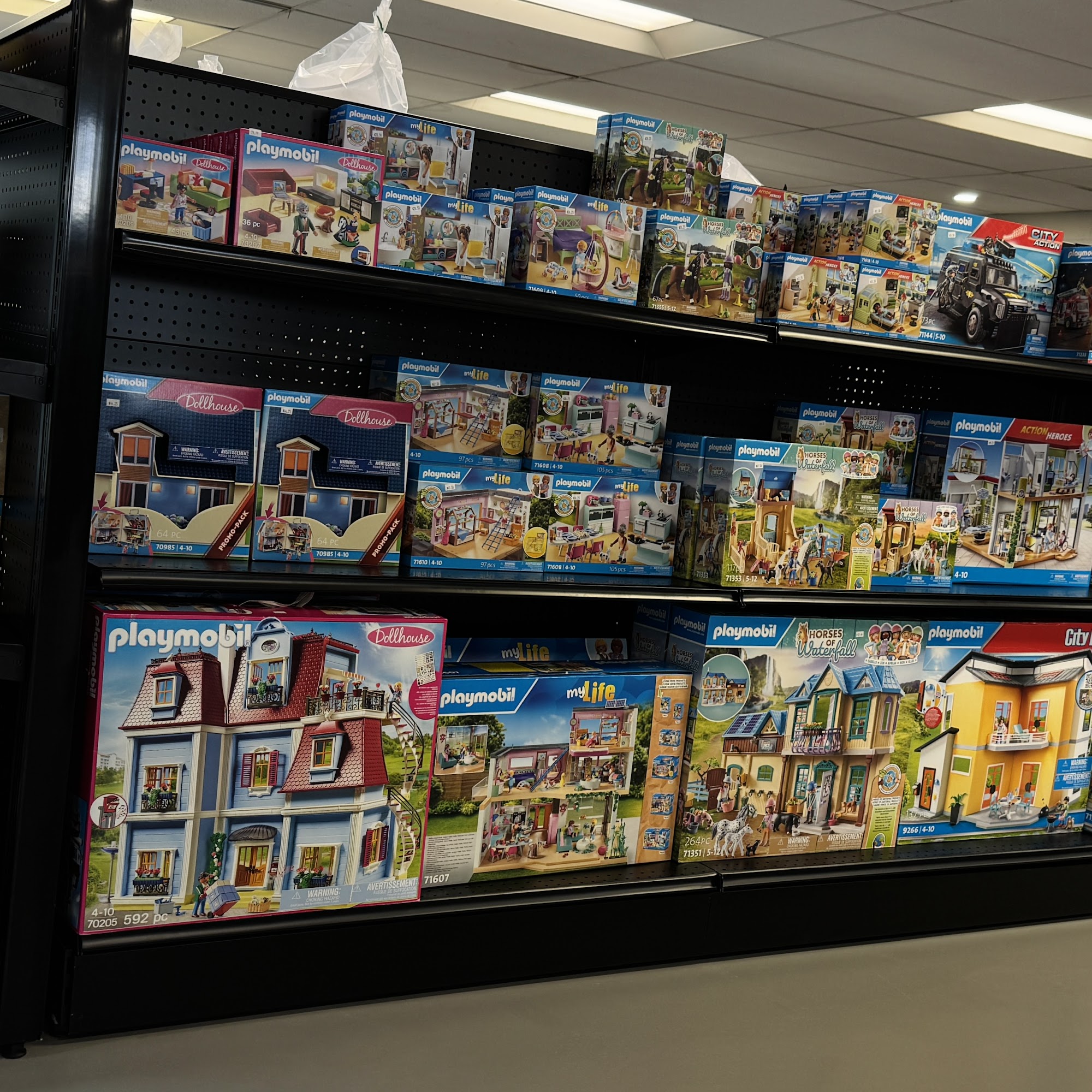 Large selection of solid color fabrics with varying textures. Assorted sewing notions, threads, Amish clothing and hosiery
