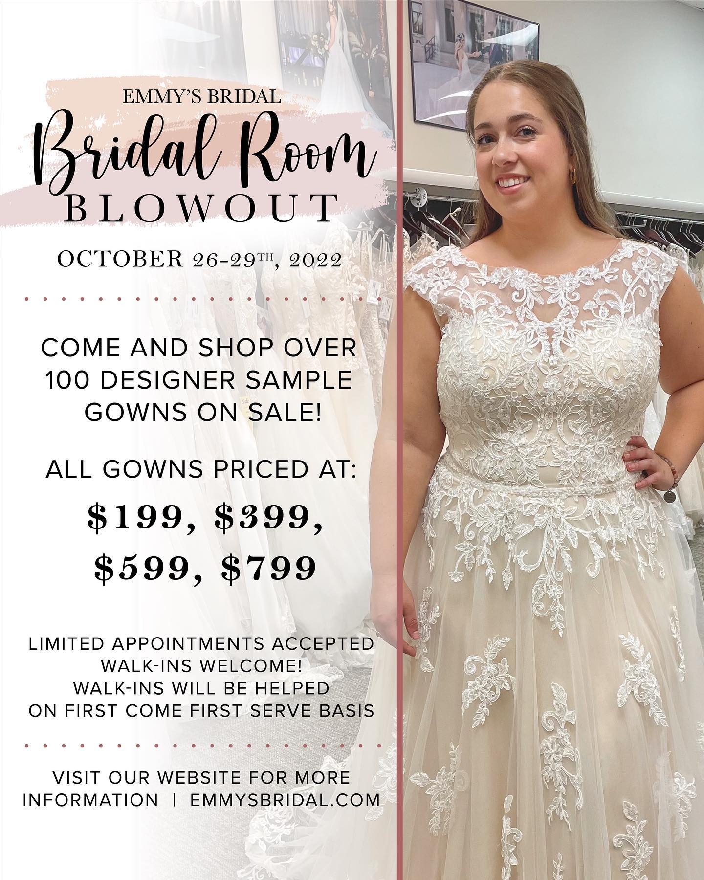 Emmy's Bridal has a wide variety of beautiful dresses for formal occasions. The employees are very attentive and begin helping you when you walk in the door.