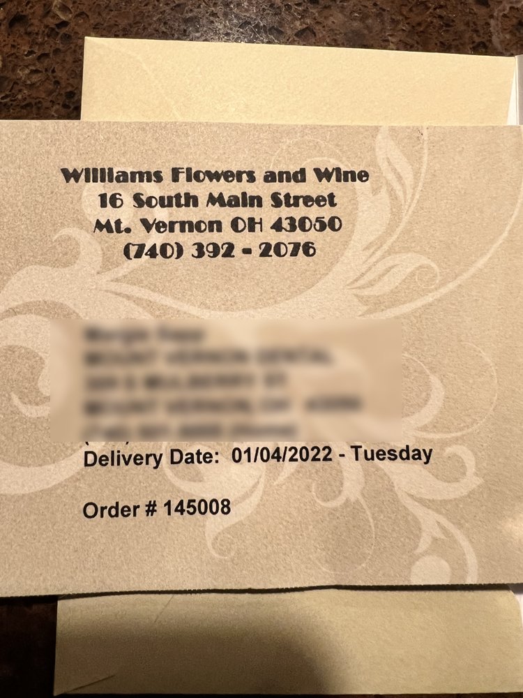 Williams Flowers and Wine has proudly been serving the Mount Vernon and Knox County, Ohio area for 100 years! They deliver to the towns of Mount Vernon, Fredericktown, Gambier, Howard, Centerburg and Utica & the following zip codes; 43080, 43022, 43011, 43019, 43014, 43028, 43050. They also service Knox Community Hospital, all area health care facilities and Funeral Homes. Featuring (seasonal) locally grown Fresh Flowers, Floral designs for all occasions, Green & Blooming Plants and Dish Gardens, Large Wine bottle selection and Gourmet wrapped Chocolates. Customers have praised the business for their beautiful flowers, prompt service, and going above and beyond to ensure delivery. The staff is described as helpful and accommodating, whether it's for a last-minute funeral order or a specific request for a birthday bouquet. Williams Flowers and Wine has a long-standing reputation in the community and is highly recommended for their quality products and exceptional customer service.