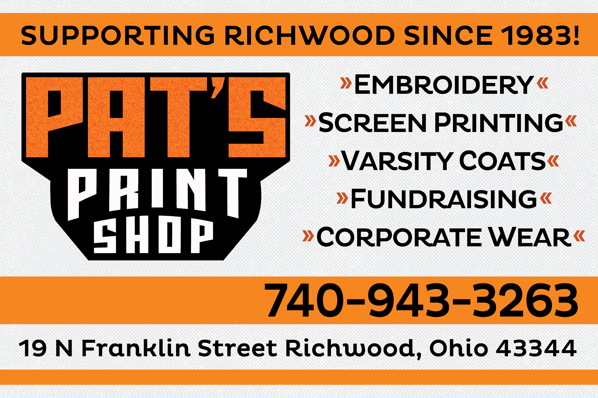 Highly recommend Pat's Print Shop! Levi and Cody are amazing to work with and the quality of their work is top notch! Reasonably priced!