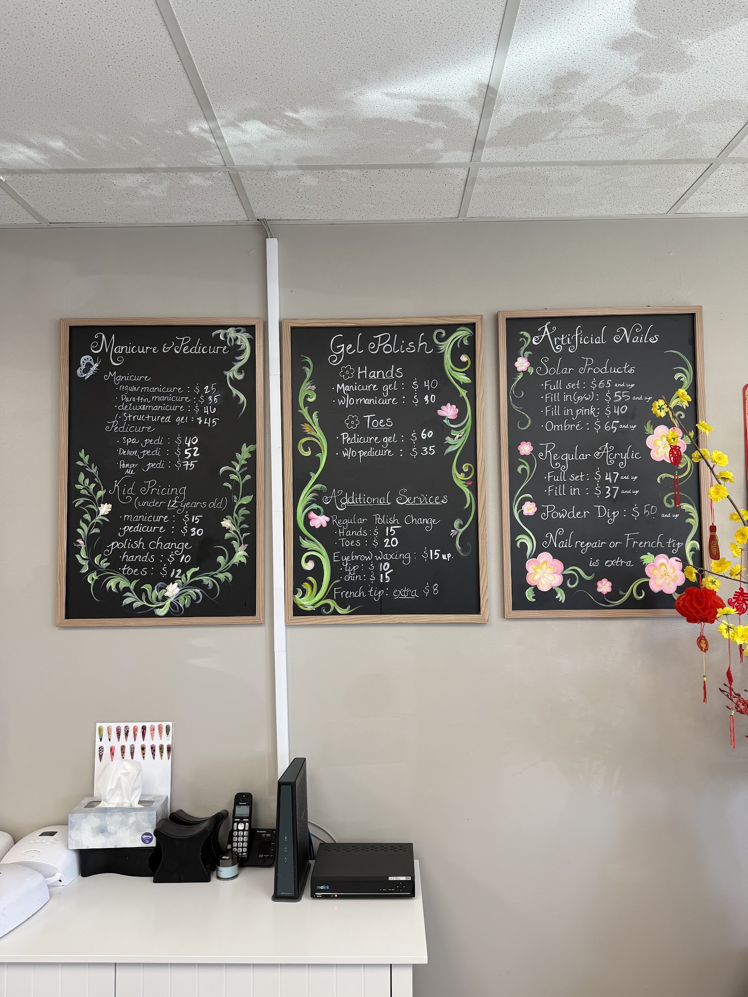 My daughter got a full set of gel nails and they still look great after a month. My pedicure has lasted forever. They are efficient and very nice - very pleasing atmosphere. Definitely recommend!