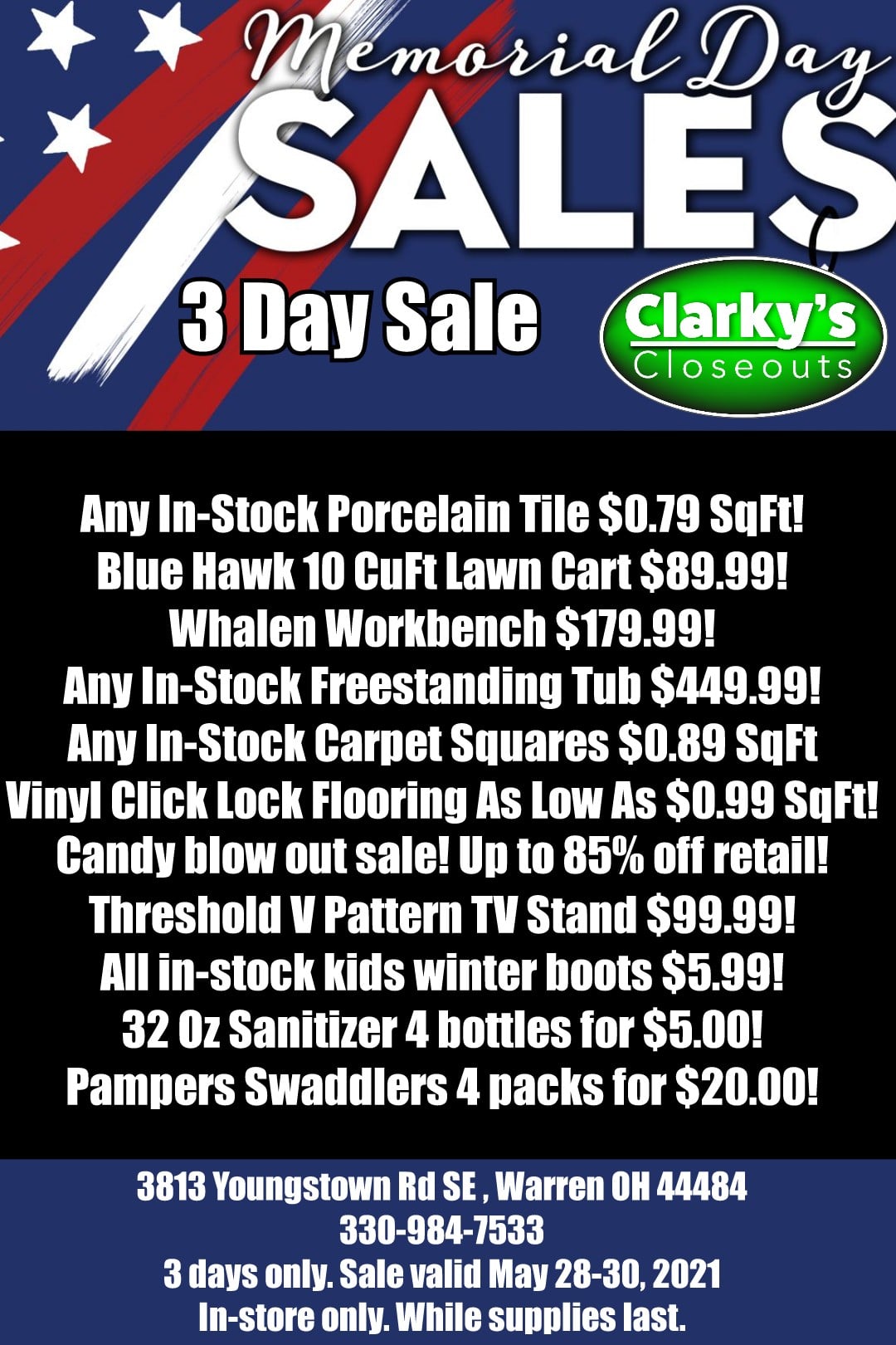 Clarky's Closeouts is an independent locally owned discount store. It offers a huge variety of items including building materials, scratch and dent appliances with a warranty, furniture, clothing, home decor, candy, toys, and seasonal decor. Customers highlight the amazing tile prices, super helpful and friendly staff, and the best prices around. The store is filled with bargains, from holiday deals to party supplies. It is a super place with a friendly and helpful team that knows the inventory well, making it worth a stop for everyone.