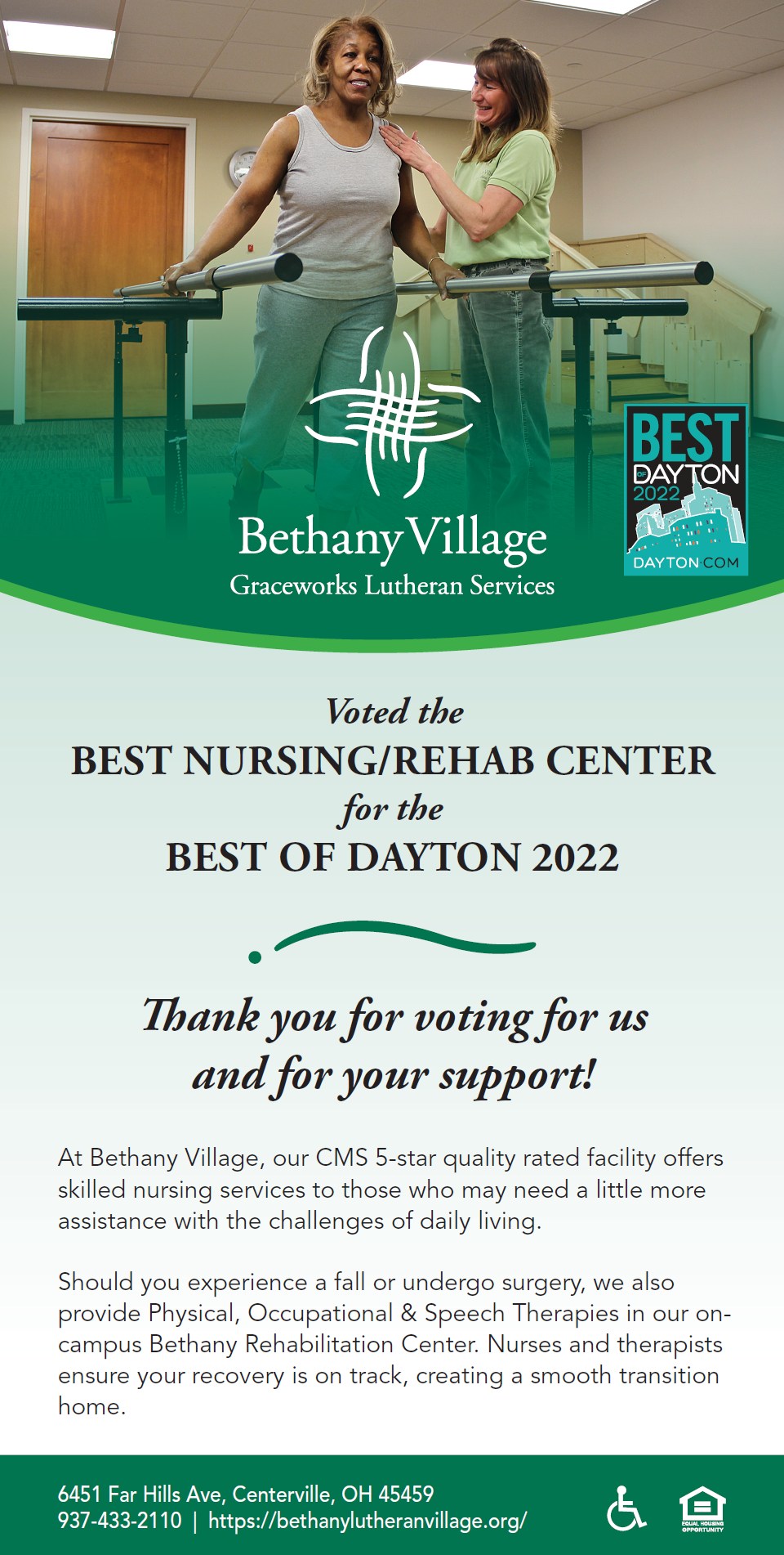 Nestled in Centerville, Ohio, near Dayton, Bethany Village offers a welcoming continuum of care for seniors. From independent living with spacious apartments and to assisted living, memory support, and skilled nursing care, residents enjoy personalized attention and an engaged community. Contact us today to find out what it's like to live at Bethany Village.