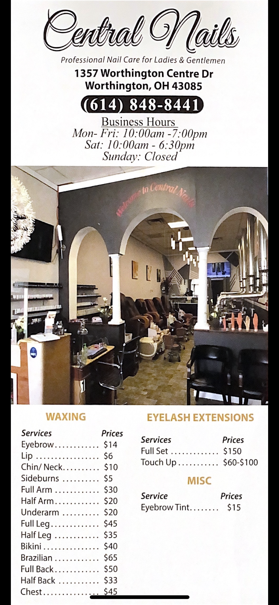 Central Nails is a family-oriented nail salon that offers high-quality products and services at reasonable rates. The staff is friendly, welcoming, and professional, making customers feel at ease. The salon provides a range of services, including nail designs, waxing, eyelash extensions, and facials, using top-quality products like dipping powders, gel manicures, and paraffin wax. The atmosphere is relaxed, with massage pedicure chairs adding to the experience. While some customers find the pricing unclear, many appreciate the excellent service and return for their nail beautification needs.