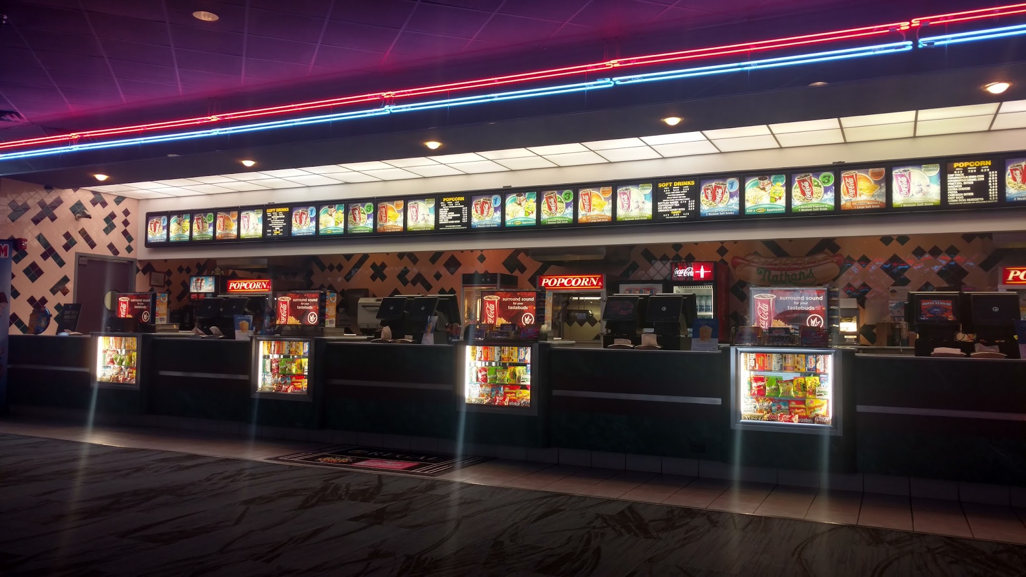 Regal Cinema South offers a generally clean and classic movie theater experience. The seating features big seats that somewhat recline and provide plenty of legroom, though they lack headrests and do not recline fully like other theaters, which can be less comfortable. Prices for tickets and concessions are high, with some items like hot dogs costing more than expected. The theater has assigned seating, but finding seats can be tricky in the dark, leading to accidental seat changes. Despite paying online and receiving a virtual ticket, a paper ticket still needs to be printed and checked. The popcorn is decent, but not quite as good as other theaters like Cinemark. Some visitors wish for more luxurious options, such as reclining seats similar to those in Tinseltown, especially for people with health issues. Overall, the experience is okay—clean, affordable snacks, and friendly staff—though it doesn't compare favorably to more upscale options. It's a small, no-frills theater suitable for a casual movie outing.