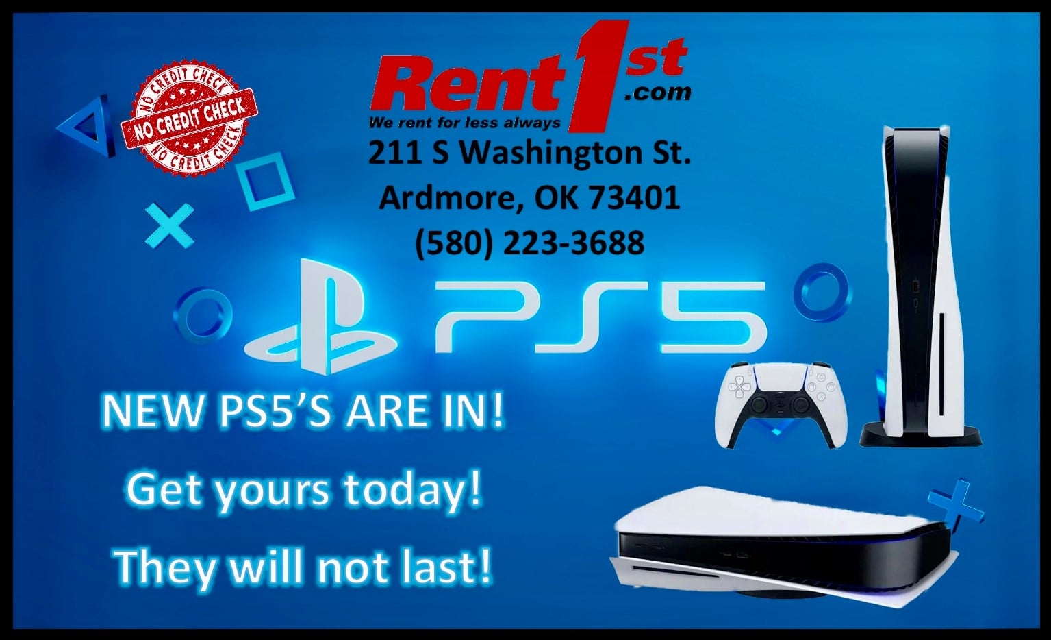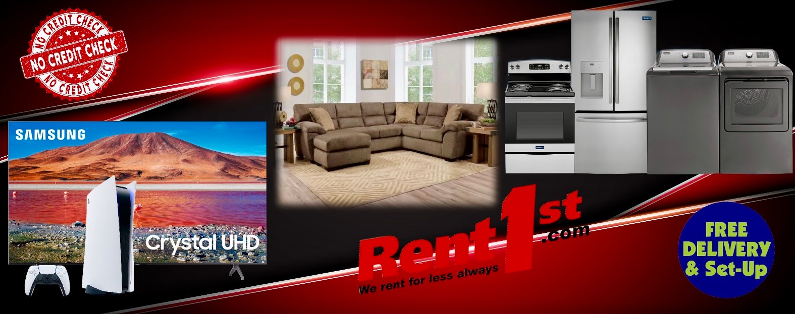 Rent 1st offers computers, tablets, big screen televisions, electronics along with refrigerators, freezers, stoves and other appliances. We also offer bedroom, living room, and diving room furniture. All items are available at weekly or monthly rates. With Rent1st, there is no credit required and never a credit check. This is because credit is not a factor here. A simple form with basic information like who you are, where you work and a few references and you can have the quality, name-brand products you deserve. We serve the city of Ardmore, Oklahoma and Carter County including Healdton, Lone Grove, Wilson, Dickson, Gene Autry, Ratliff City, Springer and Tatums. Also Love County and Marietta, Leon, Thackerville & Burneyville.