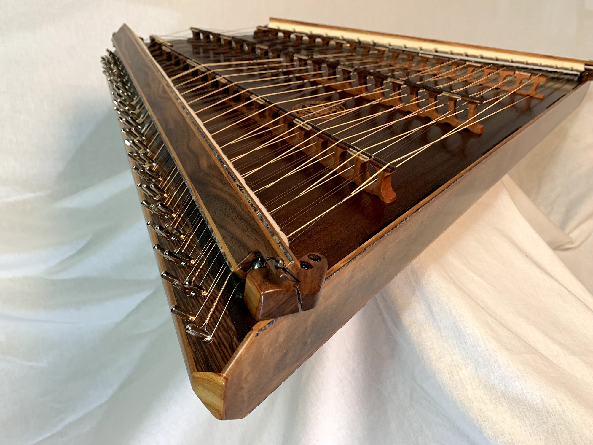 "Master Works instruments, designed by Russell Cook are among the few elite "performer quality" Hammer Dulcimers in the world. All of our instruments are crafted by hand in our workshop by Larry, Dottie, Amy, John, Rita,& Ed in Russell's small hometown of Bennington OK. We have been dedicated to setting the standard in innovation dulcimer building & design for more than 40 years. From our introductory Pioneer model, to our most professional custom models, each dulcimer is constructed from the finest materials available, creating lightweight instruments with a rich, mellow tone that stand the test of time. When visiting the workshop, you won't find a factory of machines manufacturing these beauties'. Instead you'll be greeted with a "Howdy"