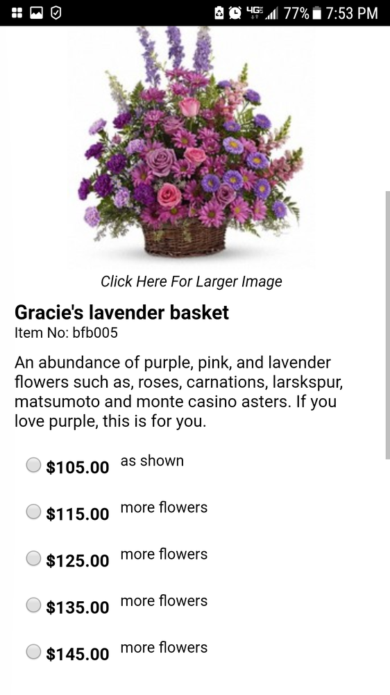Sue was very helpful and made a beautiful arrangement exactly as I had ordered it! Definitely would use Bixby Flower Basket again!