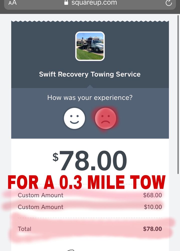 Swift towing was just that “Swift” to arrive! Professional and polite, getting our car home safely. I Would recommend this company for anyone needing towing help! Super Swift! Thank you👍