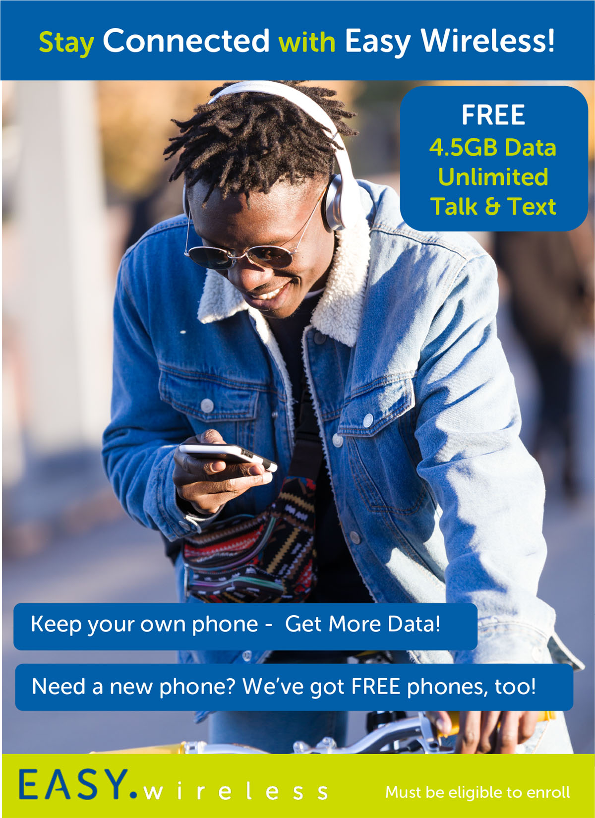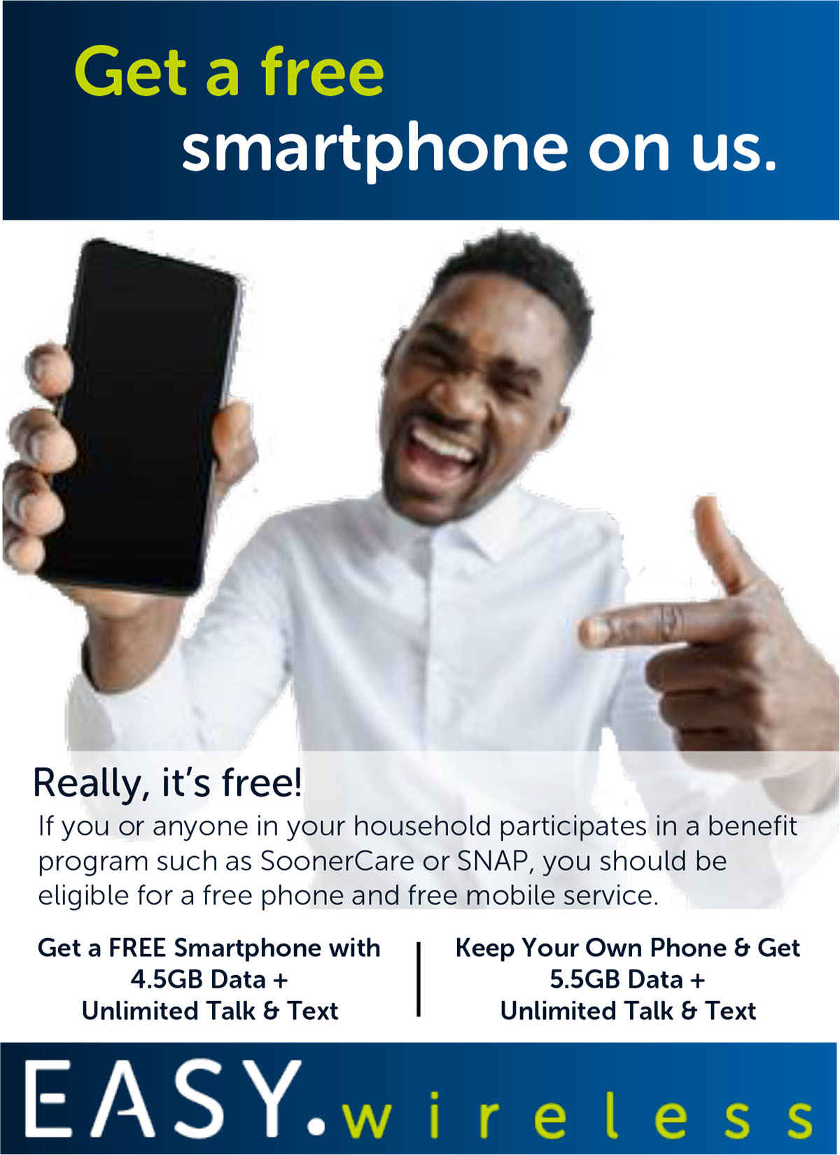 Get a FREE Smartphone with FREE monthly Talk, Text, and Data from EASY Wireless to eligible consumers who come in and qualify for the Lifeline Program. Sit back and relax while our customer service agents help enroll you for this FREE service. You will also find a great selection of UPGRADED phones and accessories for you to choose from. Lifeline is a nontransferable government assistance program limited to one discount per household. Only eligible consumers may enroll. Easy Telephone Services Company is an eligible telecommunications carrier.