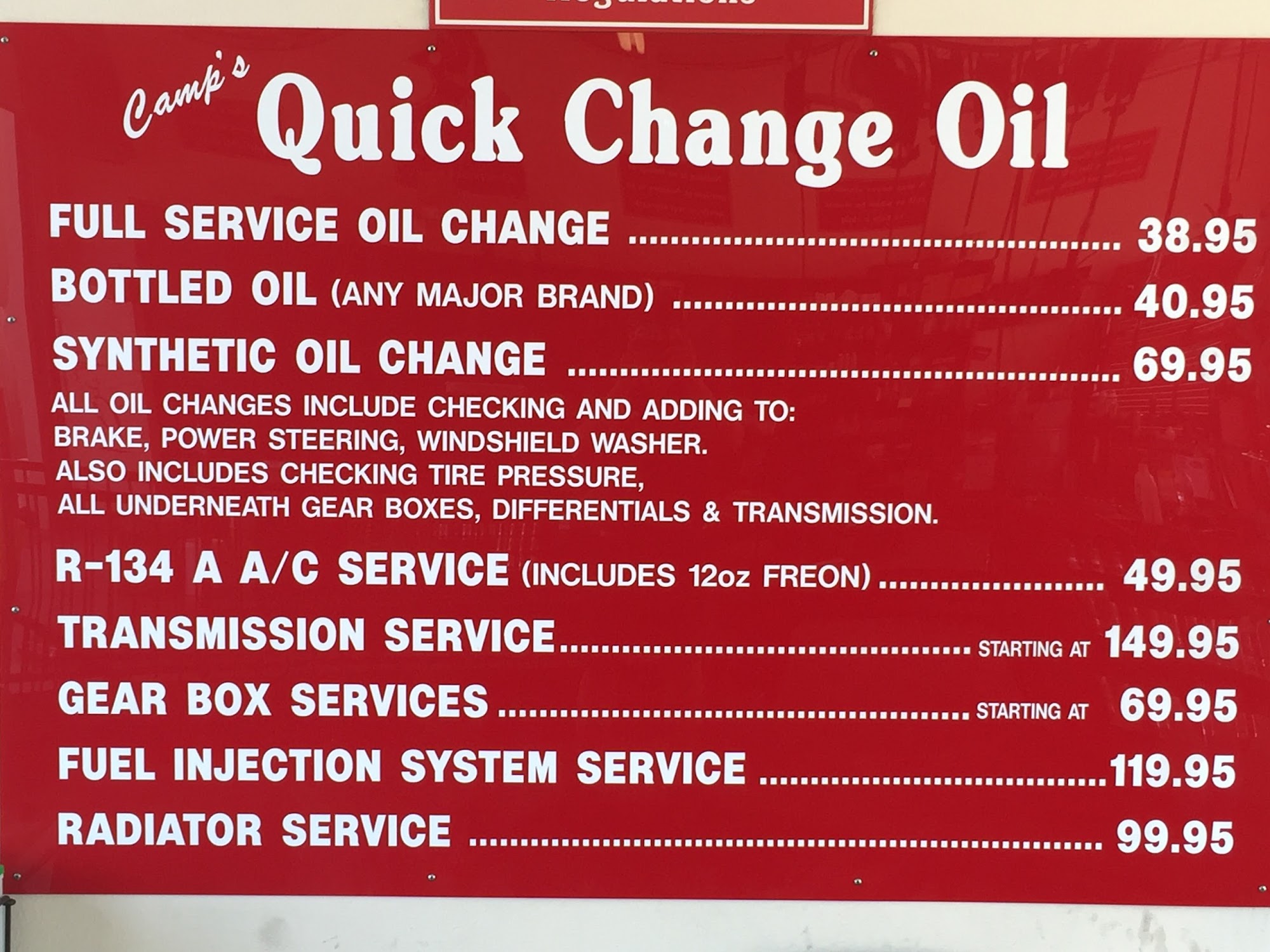 Camp's Quick Change Oil Co. is a reliable and affordable automotive service provider that has consistently impressed its customers. Known for its friendly staff, speedy service, and transparent pricing, the company has earned a reputation for delivering a pleasant and efficient oil change experience. Customers appreciate that the staff does not try to upsell or push unnecessary services, but instead focuses on addressing the specific needs of their vehicles. With a long history of satisfied customers and a commitment to providing quality service, Camp's Quick Change Oil Co. is a trusted choice for anyone in need of a reliable oil change in the local area.