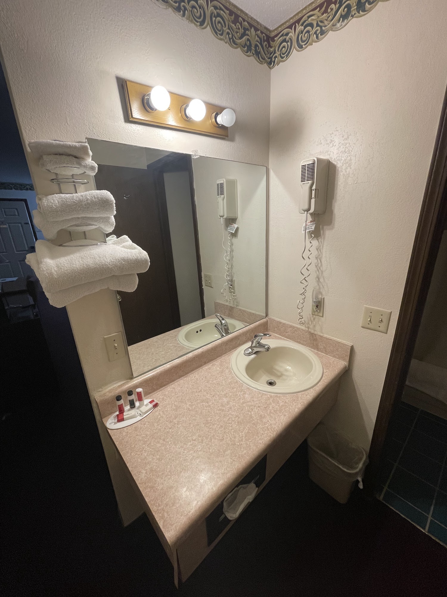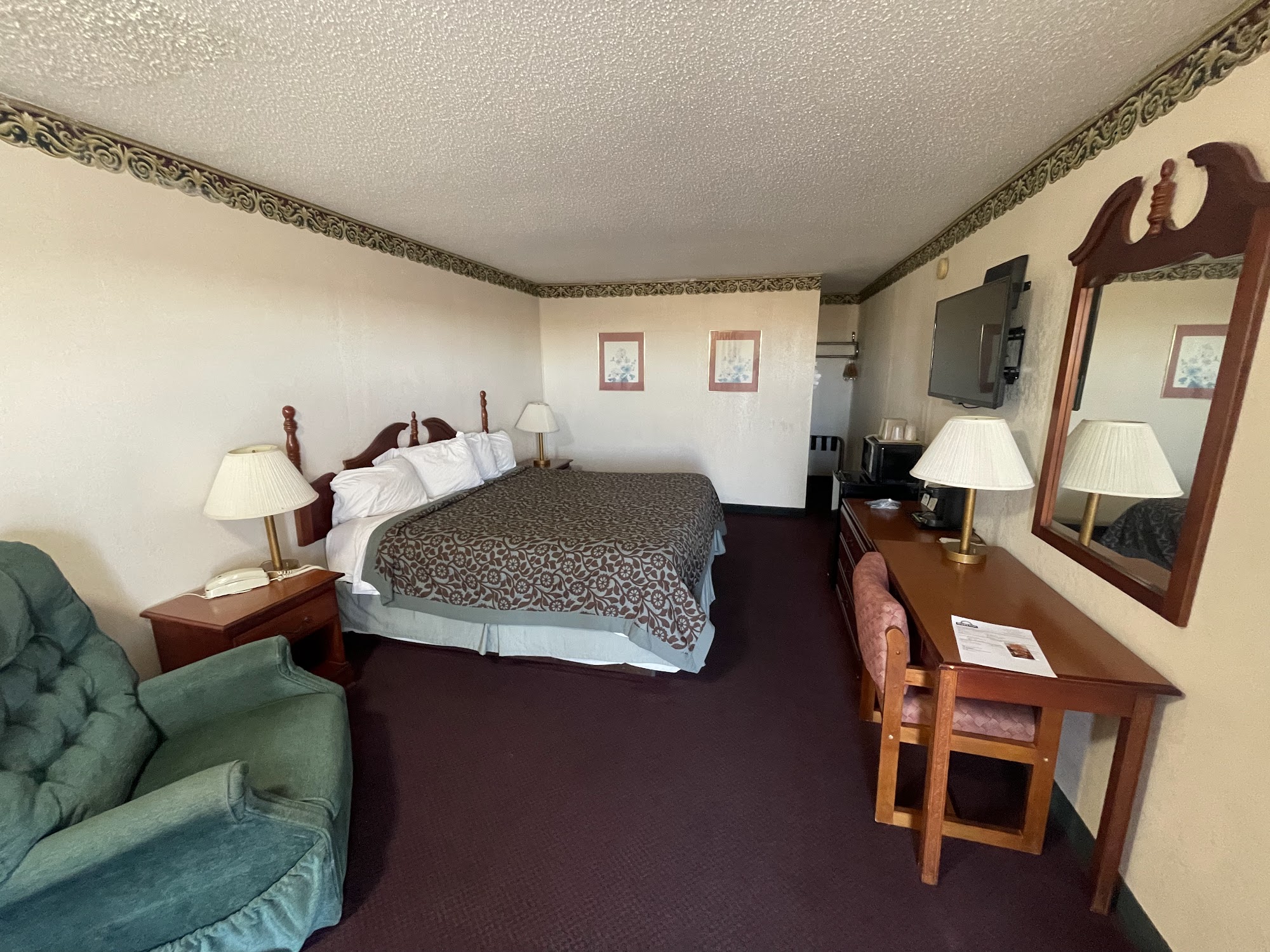 Easy off the highway. Truck stop across the street but no noise with air conditioner running. Nice easy stopRooms: Room was large and clean, could use some cosmetic work, bathroom older but adequate. Desk hostess is very nice