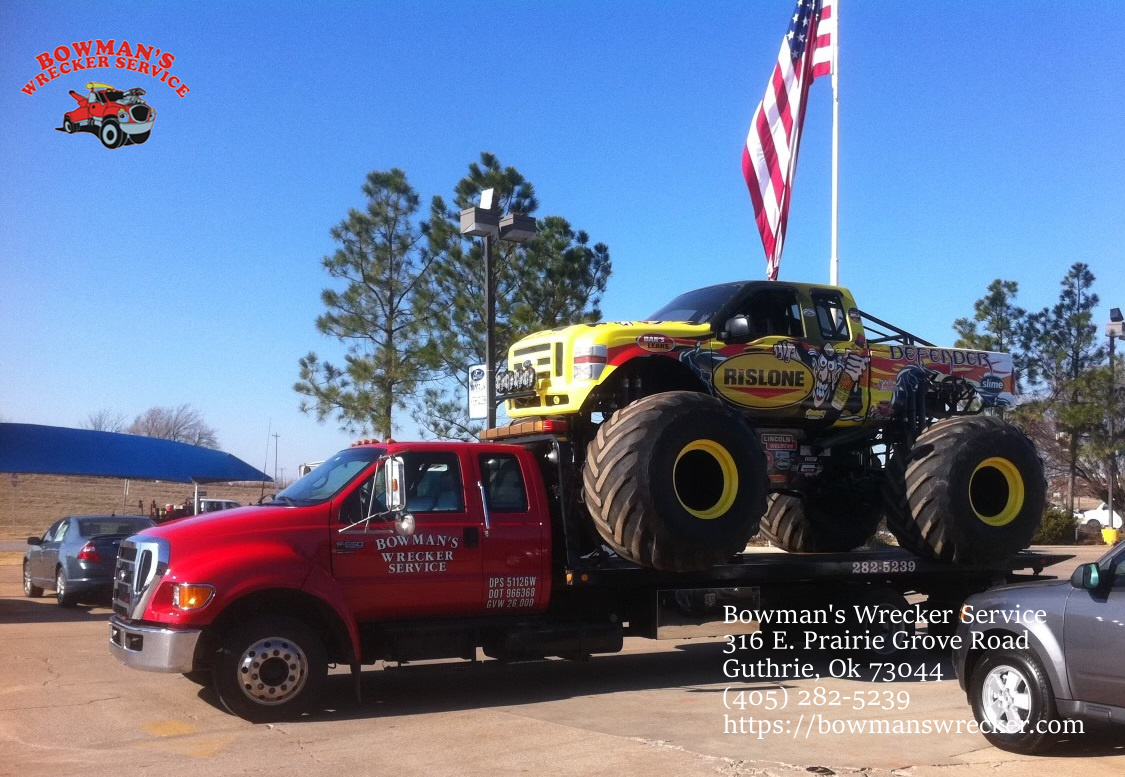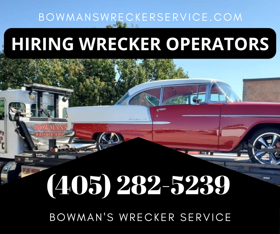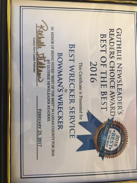 #1 Bowman's Wrecker Service since 1987 in Guthrie, Oklahoma. We offer towing and recovery, roadside fuel delivery, and 24/7 Emergency Response in Logan County and North Oklahoma County on Interstate 35, State Highway 74, State Highway 33, and State Highway 51. We respond to Crescent, Deer Creek, Edmond, Guthrie, Coyle, Langston, Arcadia, Marshall, and Mulhall-Orlando in Oklahoma. Bowman's Wrecker Service operates one of the only 4x4 wreckers in the surrounding area. We pick up and deliver cars and pickups to several repair facilities in Logan County. Bowman's operates 5 wreckers including a traditional wheel-lift wrecker and a Roll-back wrecker. We work with local customers and law enforcement on a daily basis, both local and long distance.