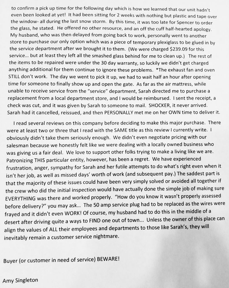 Optimum RV Oklahoma City is highly praised for its exceptional service and customer care. Customers frequently mention the honesty and integrity displayed by the staff, particularly the salespeople, who are described as friendly and accommodating. Many reviews highlight the efforts of team members who go above and beyond, such as providing detailed information on RVs and even addressing issues like tire replacements before customers arrive. Visitors appreciate the quick and efficient financing process, often completing their purchases in just a couple of hours. The dealership is recognized for its helpfulness, including prompt service for repairs, such as air conditioning fixes, which saved clients both time and stress. Additionally, customers commend the transparency in pricing, noting that the prices offered are competitive and fair compared to other dealerships nationwide. The overall experience at Optimum RV is characterized by a family-like atmosphere, where customers feel valued and cared for. Many express their intention to recommend the dealership to others and return for future purchases, confirming that Optimum RV Oklahoma City is a trusted choice for both new and pre-owned RV needs.