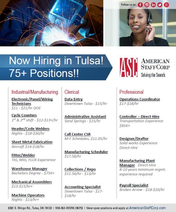 American StaffCorp is a staffing and recruiting agency providing services to Oklahoma businesses since 1967. Reviews describe it as an awesome and top-notch staffing agency. The staff are noted as nice, professional, helpful, and know what they are doing. The process is reported as straightforward, simple, and consistent, with recruiters responding in a timely manner. Many clients state they were placed with great companies and have great jobs, sometimes with great starting pay and a quick transition to full-time. Multiple reviewers indicate they would definitely recommend American StaffCorp for job placement.