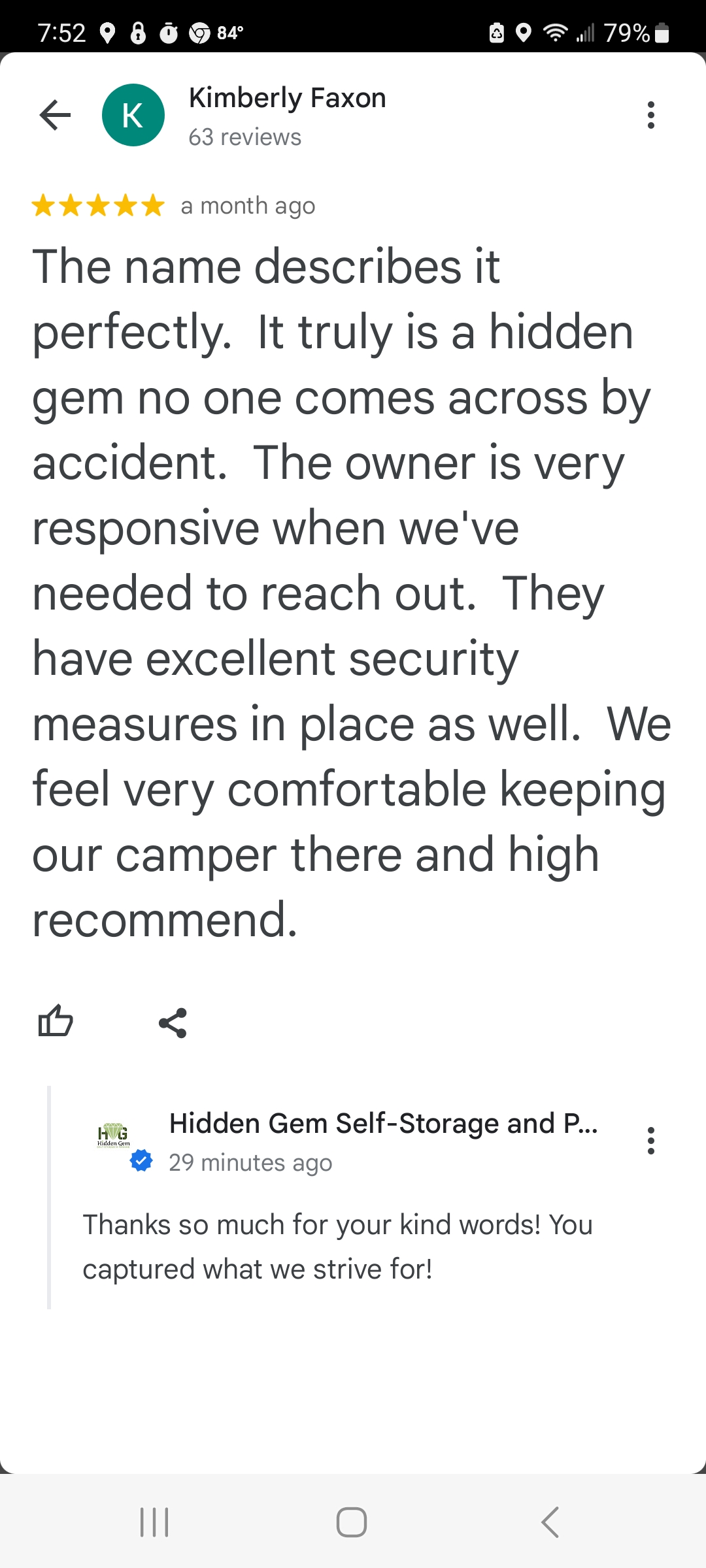 Hidden Gem Self-Storage and Parking is a highly recommended facility known for its great service and security. Customers appreciate the reasonable prices and the secure grounds that make them feel comfortable storing their belongings, including campers and larger units. The owner is very responsive, handling issues promptly and ensuring a positive experience. The facility offers 24-hour access and has excellent security measures in place. Many tenants highlight the owner's caring attitude and quick assistance, which makes storing there a convenient and reliable choice. Overall, Hidden Gem provides a clean, safe, and friendly environment, with attentive staff dedicated to meeting storage needs effectively.