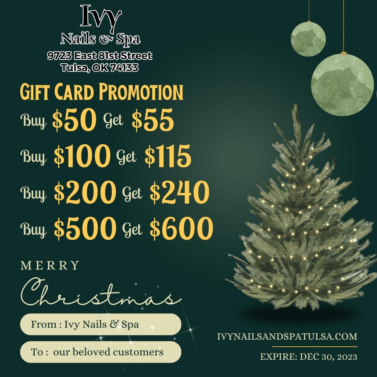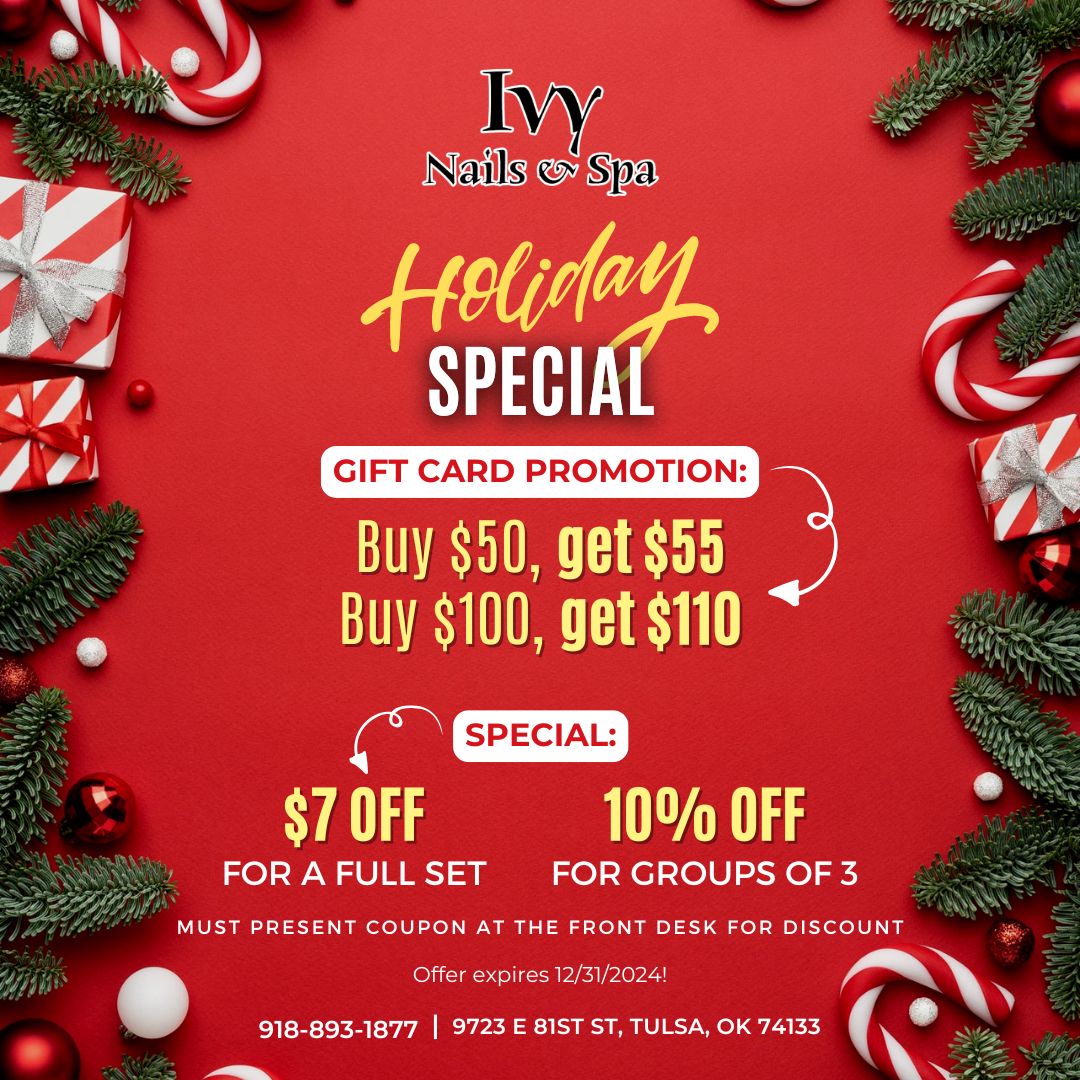 Located in the heart of Tulsa, OK 74133, Ivy Nails & Spa has become an industry leader in nail services. Our nail salon was founded on the idea of delivering only the finest nail and spa services to clients all over the Tulsa area. Ivy Nails & Spa is a haven of relaxation that promotes comfort, beauty, well-being, and health. Our priorities are client-focused services, high-quality products, and above all else, grade-A sanitation standards.