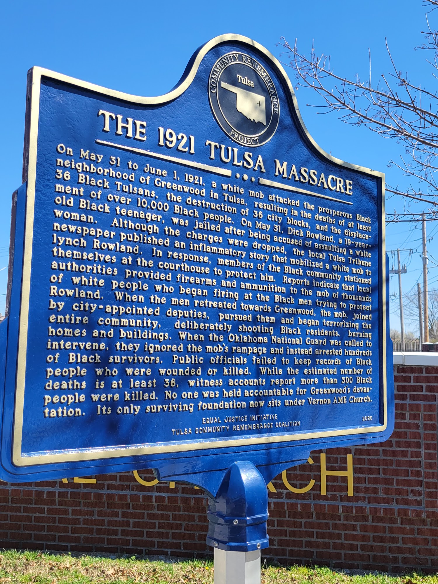 Historic Vernon African Methodist Episcopal Church was founded in 1905 and the basement of the current edifice was built in 1919. During the worst race massacre in American history, the Tulsa Race Massacre of 1921, the superstructure, parsonage, and sanctuary still under-construction were destroyed but the basement remained as a symbol of God's persevering power. The congregation completed the current sanctuary in 1925. In fact, Vernon AME Church is the only intact, standing black-owned structure that remains from the Historic Black Wall Street era.