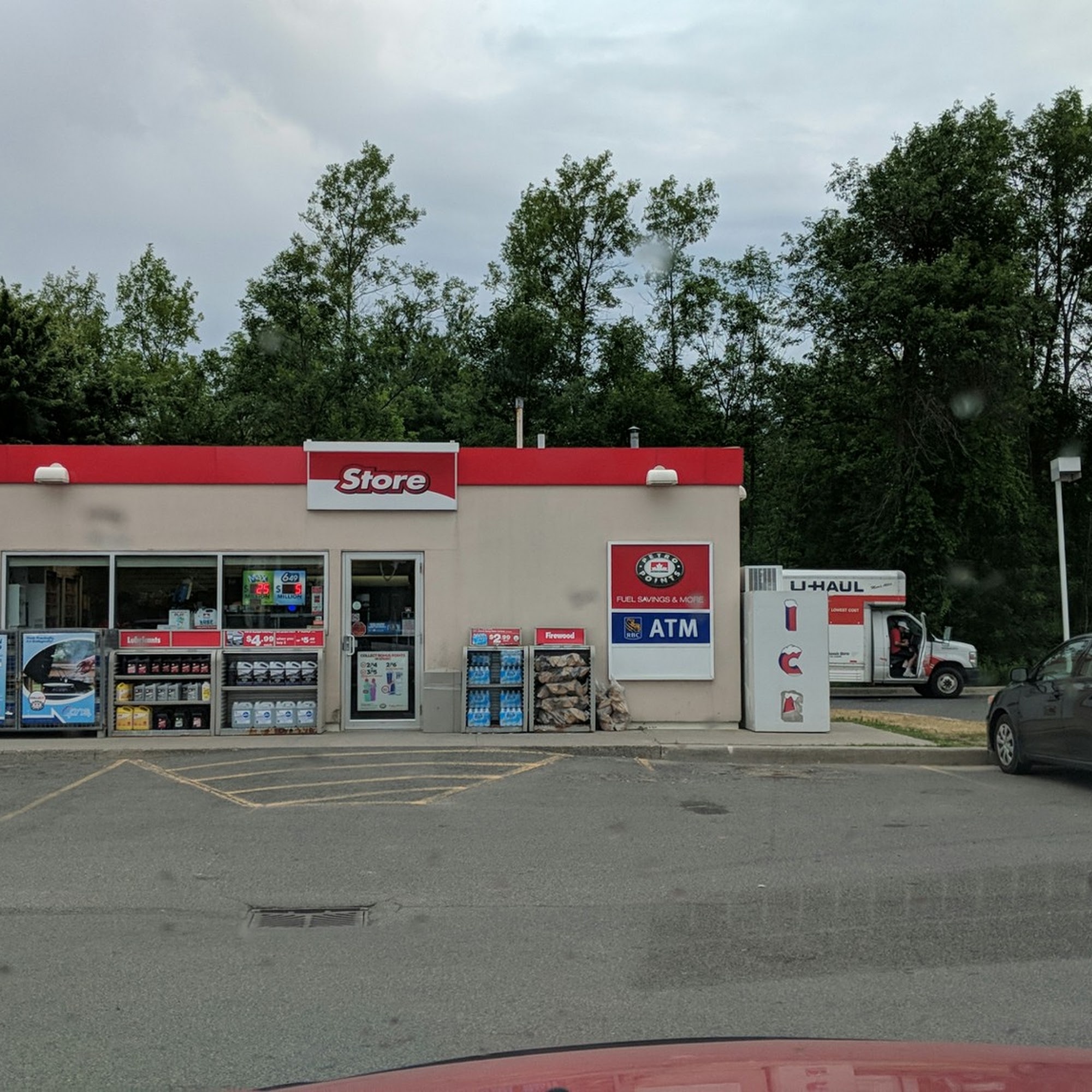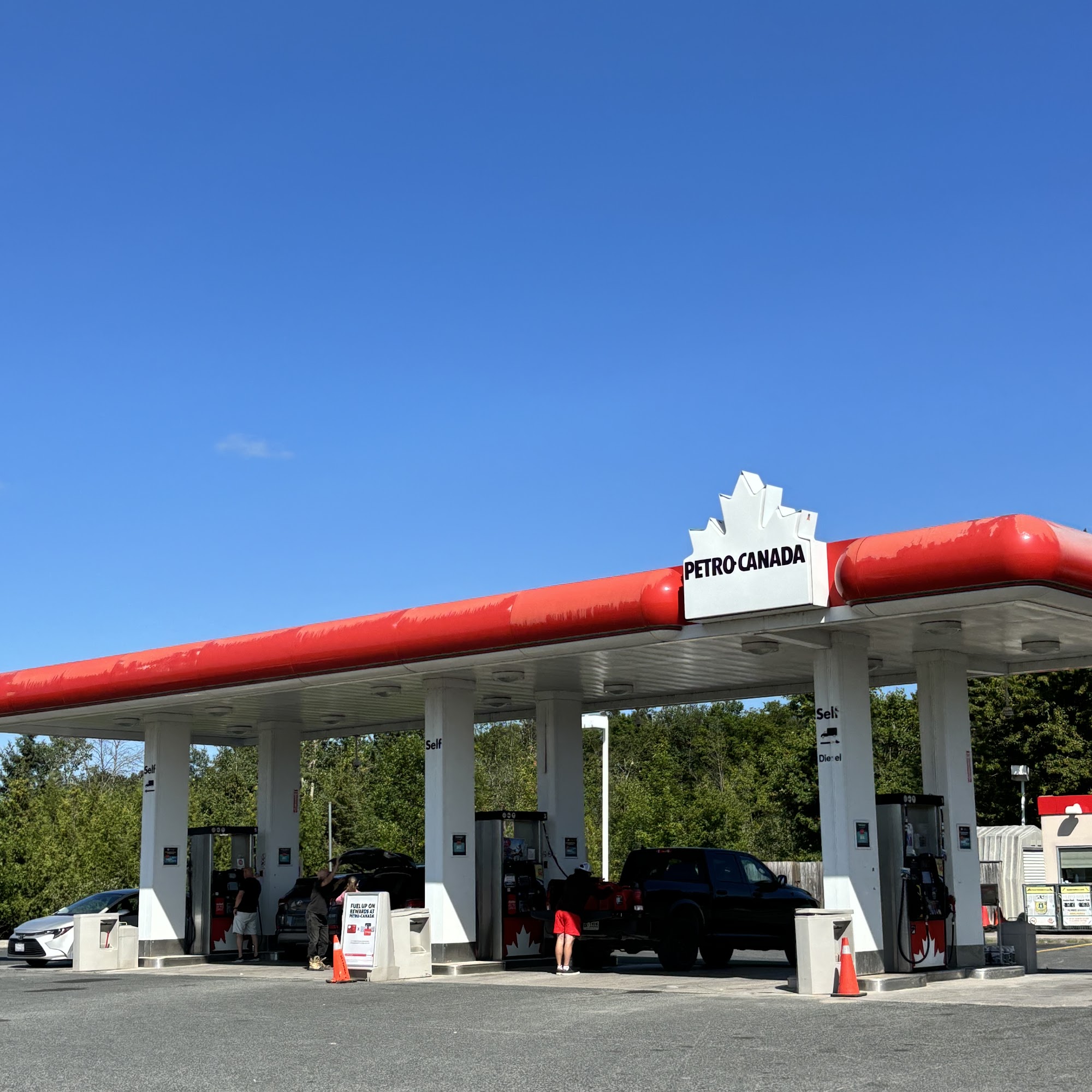 Standard Petro-Canada gas station. I go here 2-4 times per month. Lots of space. Big trucks should have no issues getting in here. Having Tim Hortons right beside is a good thing too. There is a tire pump available too. Small store inside if you need something quick, but be better off going to the Foodland for food or snacks.