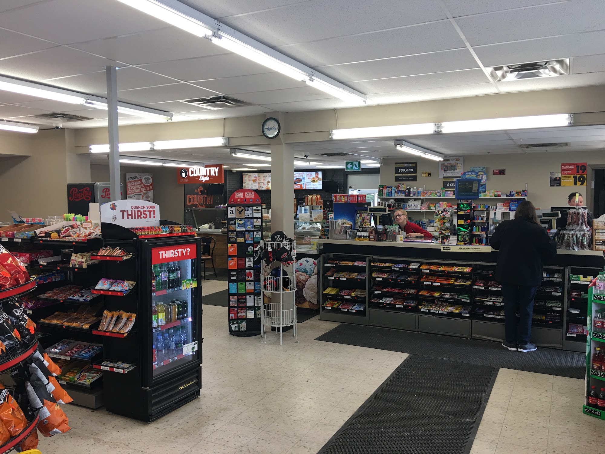 One stop place for gas and large convenience store and donut shop
