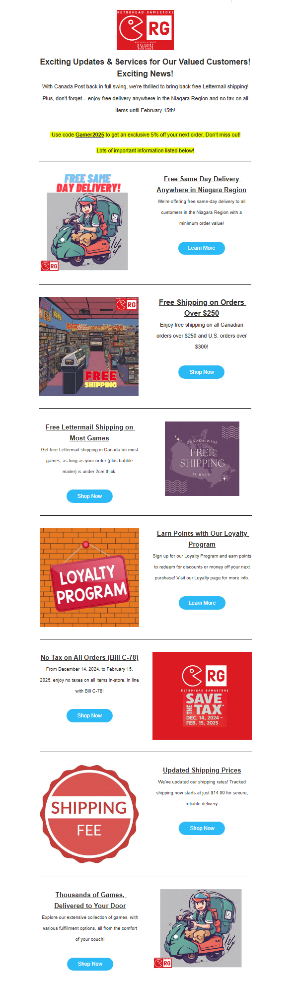 RetroHead GameStore is an online-only retro video game store that offers a great selection of well-priced games for various consoles. Customers have praised the store's fast delivery, with same-day or next-day service available in the Niagara Region. The store's communication is also commended, with customers receiving regular updates on their orders. While most orders arrive in perfect condition, a few customers have reported that they needed to clean the discs before the games would work properly. However, the overall experience is described as easy and convenient, with flexible curbside pickup options. Retrohead GameStore's commitment to quality is evident, as all items are tested and guaranteed, and defective item returns are accepted. With free shipping on most games in Canada, competitive prices, and a wide range of retro titles, RetroHead GameStore has earned positive reviews from satisfied customers who plan to shop there again in the future.