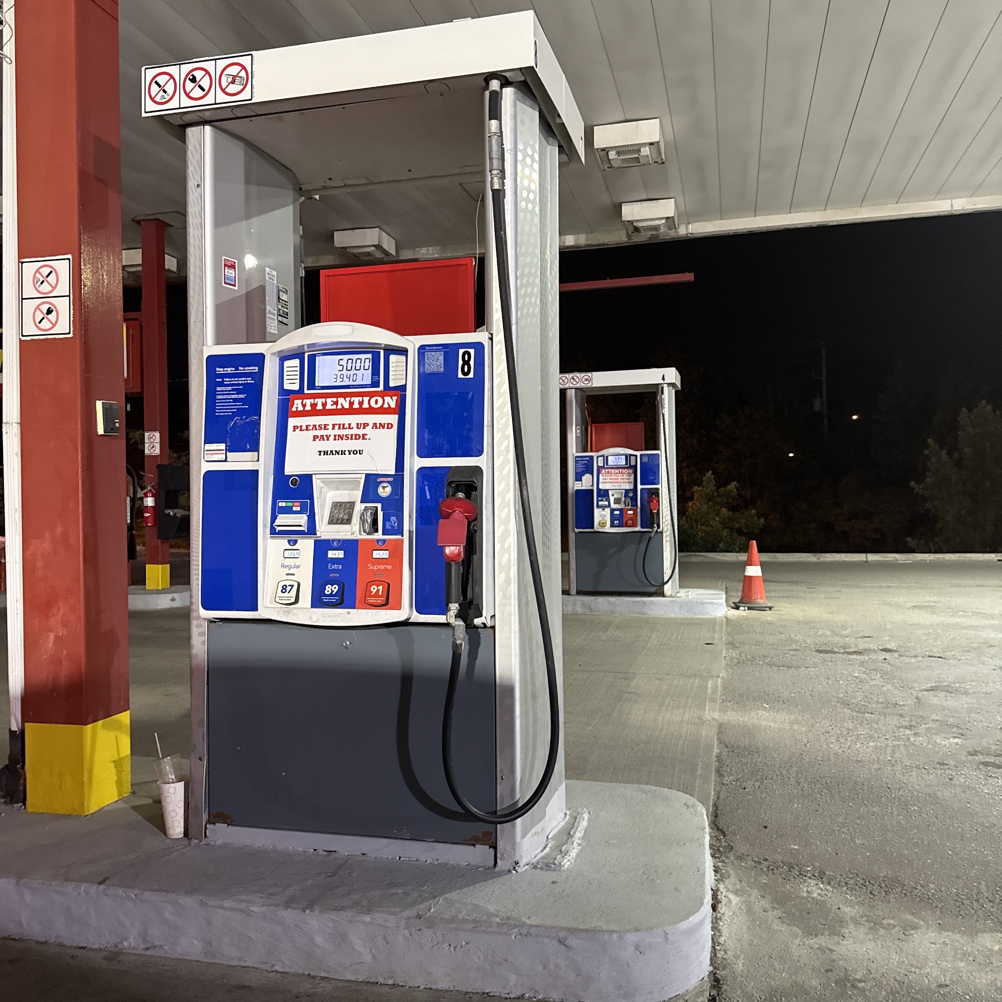 I am sure when the Gas Station is closed they have to turn off their Banner lights But I saw Armco Gas Station in Sheppard and Leslie St Banner is On and also the Price is on the Screen, when I came in the Station I saw all Pomps are has the note please Fill up and pay inside, no one was there and the Pomps didn’t work.
